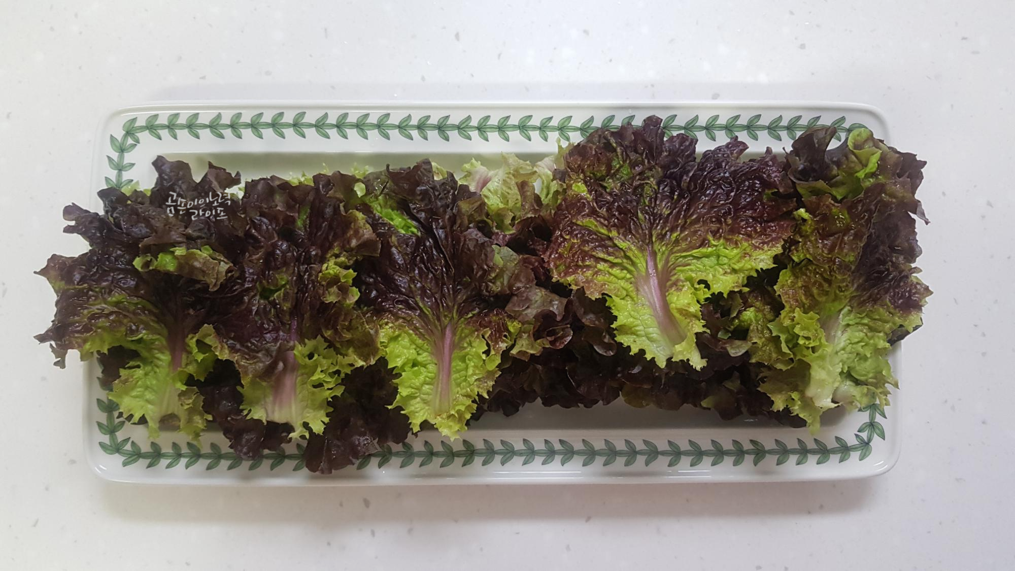 깨끗이 씻어놓은 상추와 깻잎을 정당한 크기로 잘라주세요.