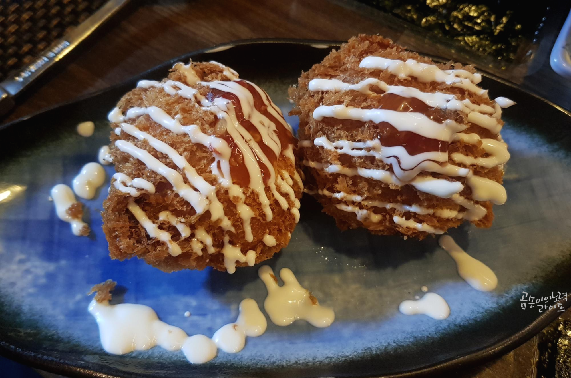 전복죽을 먹고 나면 심상치 않아 보이는 계란말이와 초밥이 나왔어요.