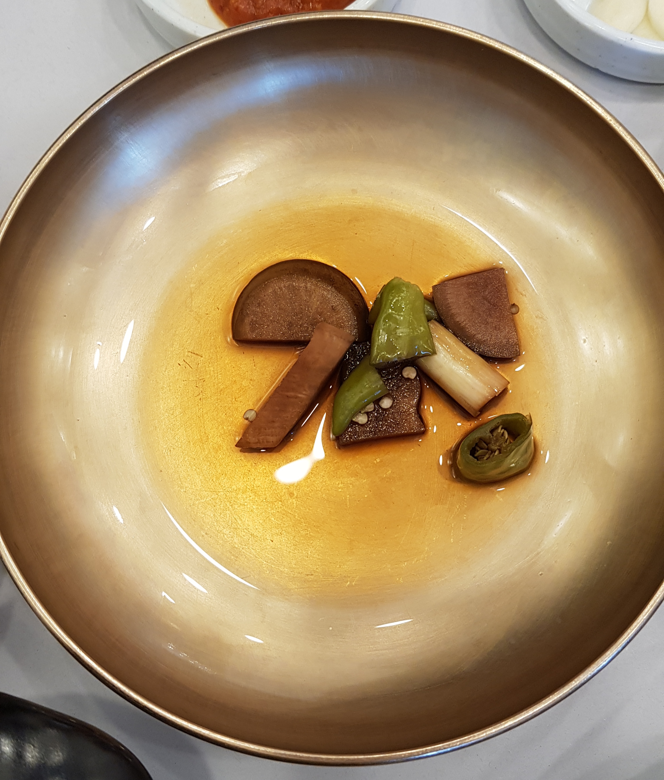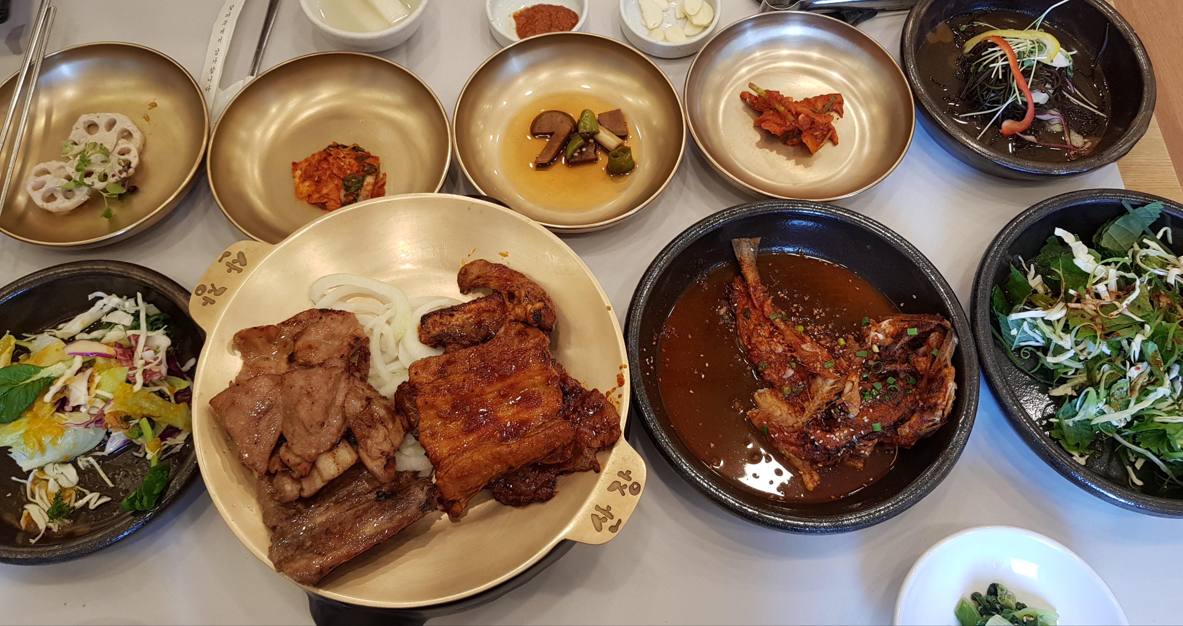 음식들이 모두방짜유기그릇에 담겨있으니 더 맛있어 보이지만