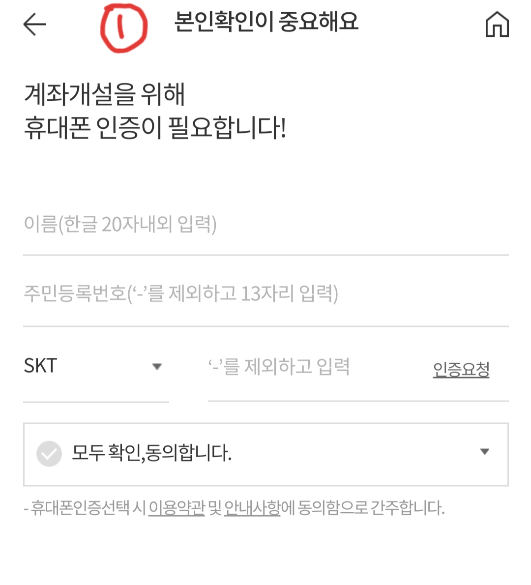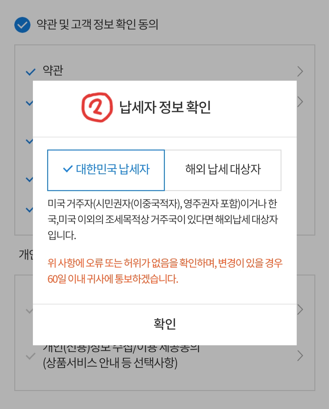계좌 개설을 위한 휴대폰 본인인증을 하고납세자 정보도 확인해 주세요.
