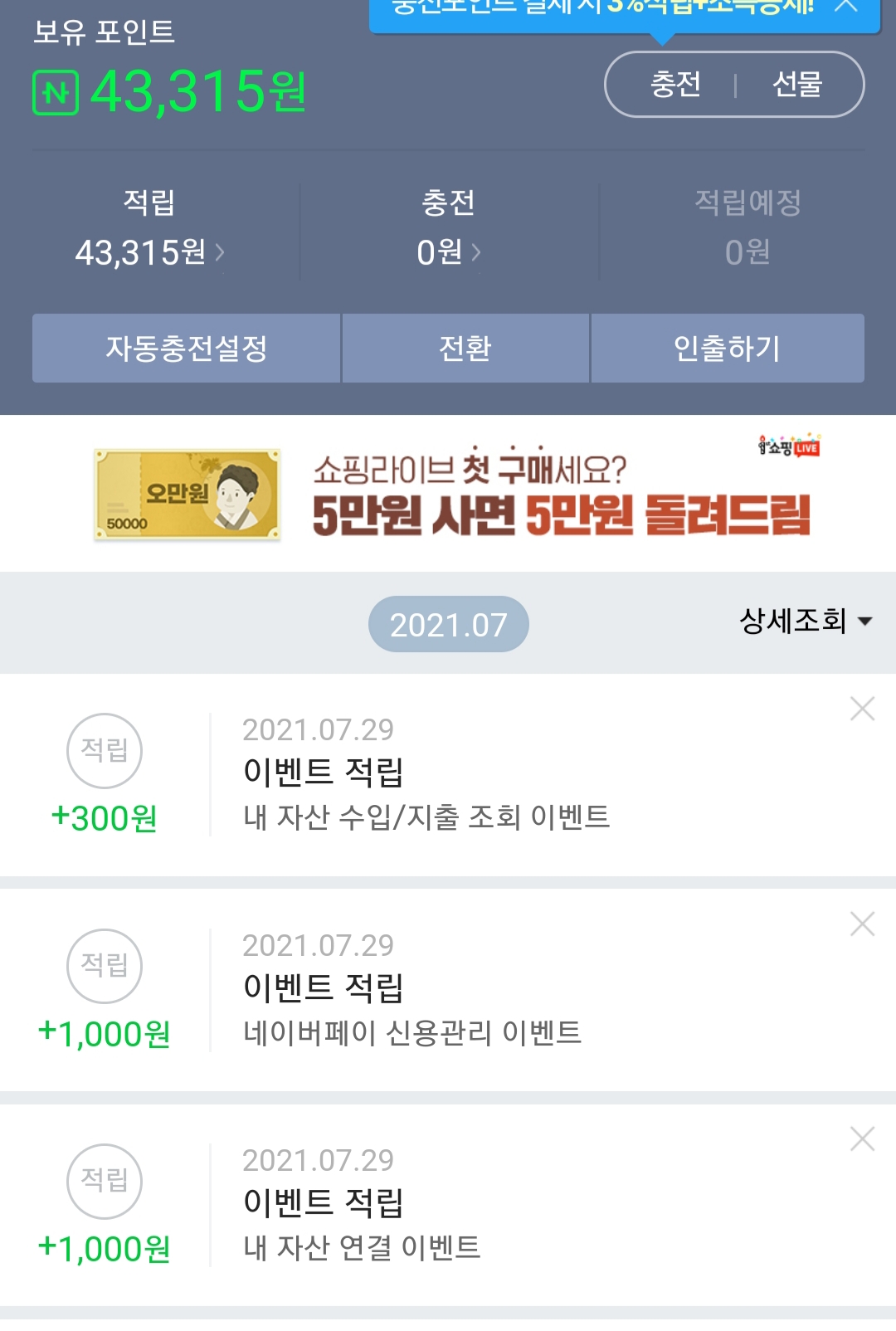 매일 네이버페이로 들어가서 나의 수입˙지출 내역을 확인하는 것만으로도 포인트를 받을 수 있어요.