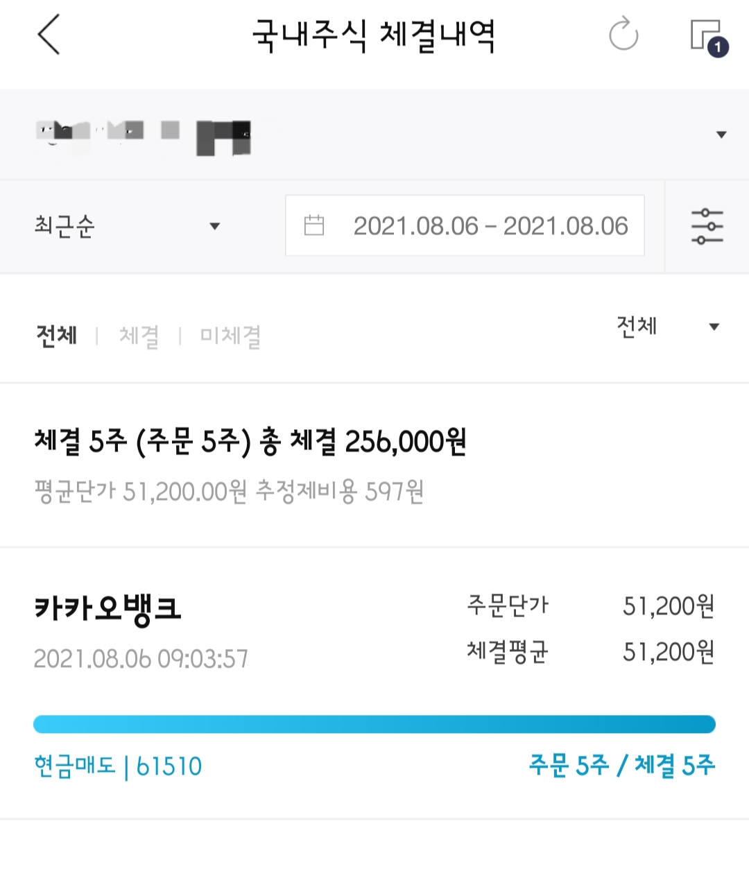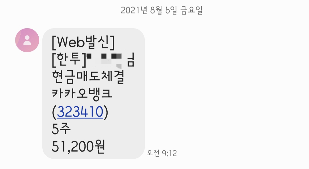 시작되고3분 만에 급하게 51,200원에 다섯 주 모두 팔아버렸습니다.