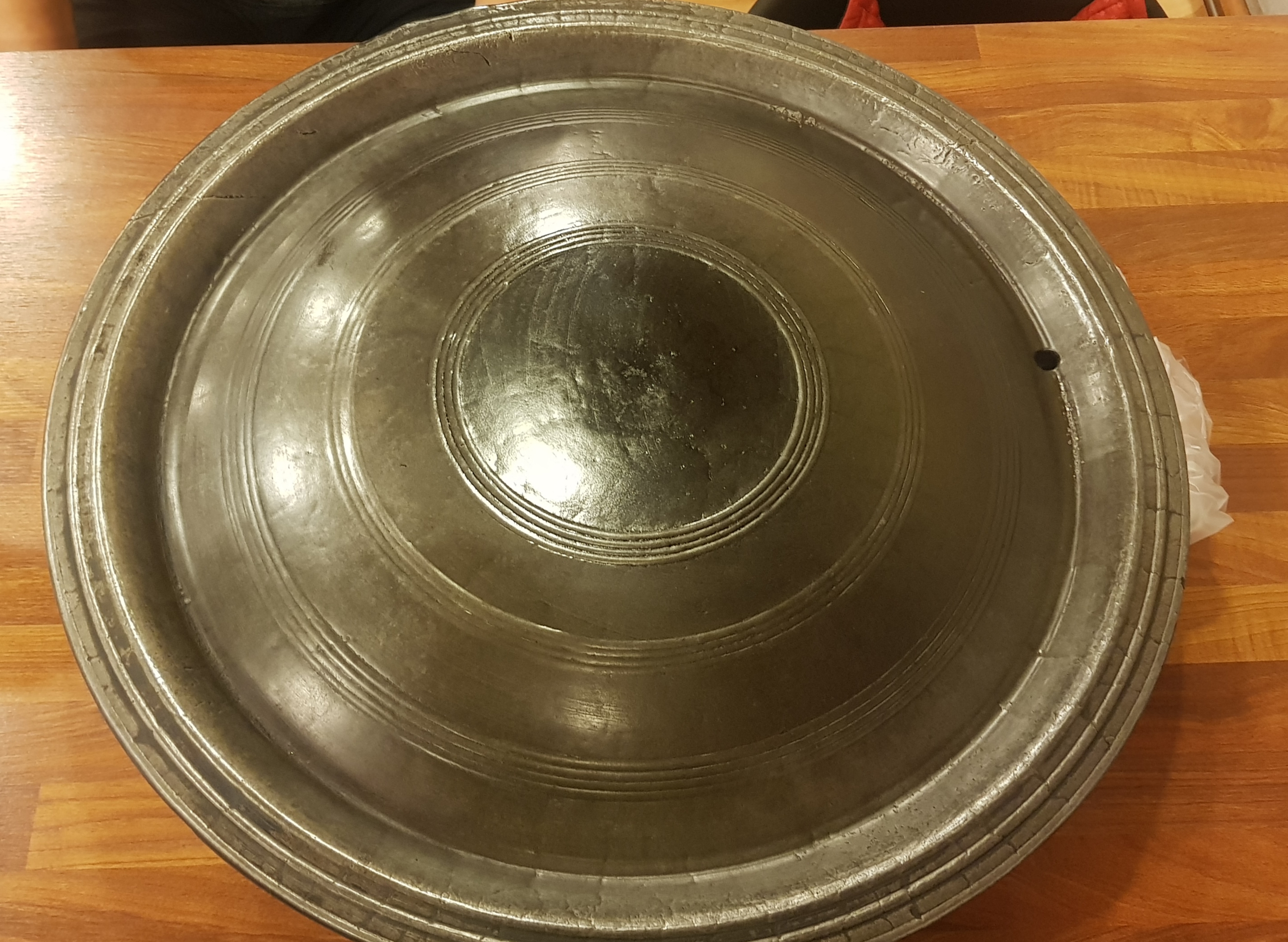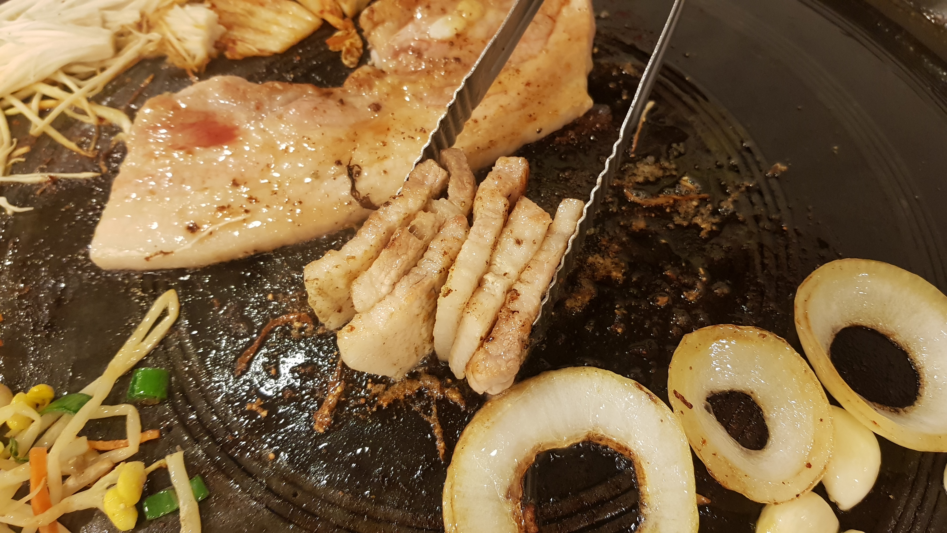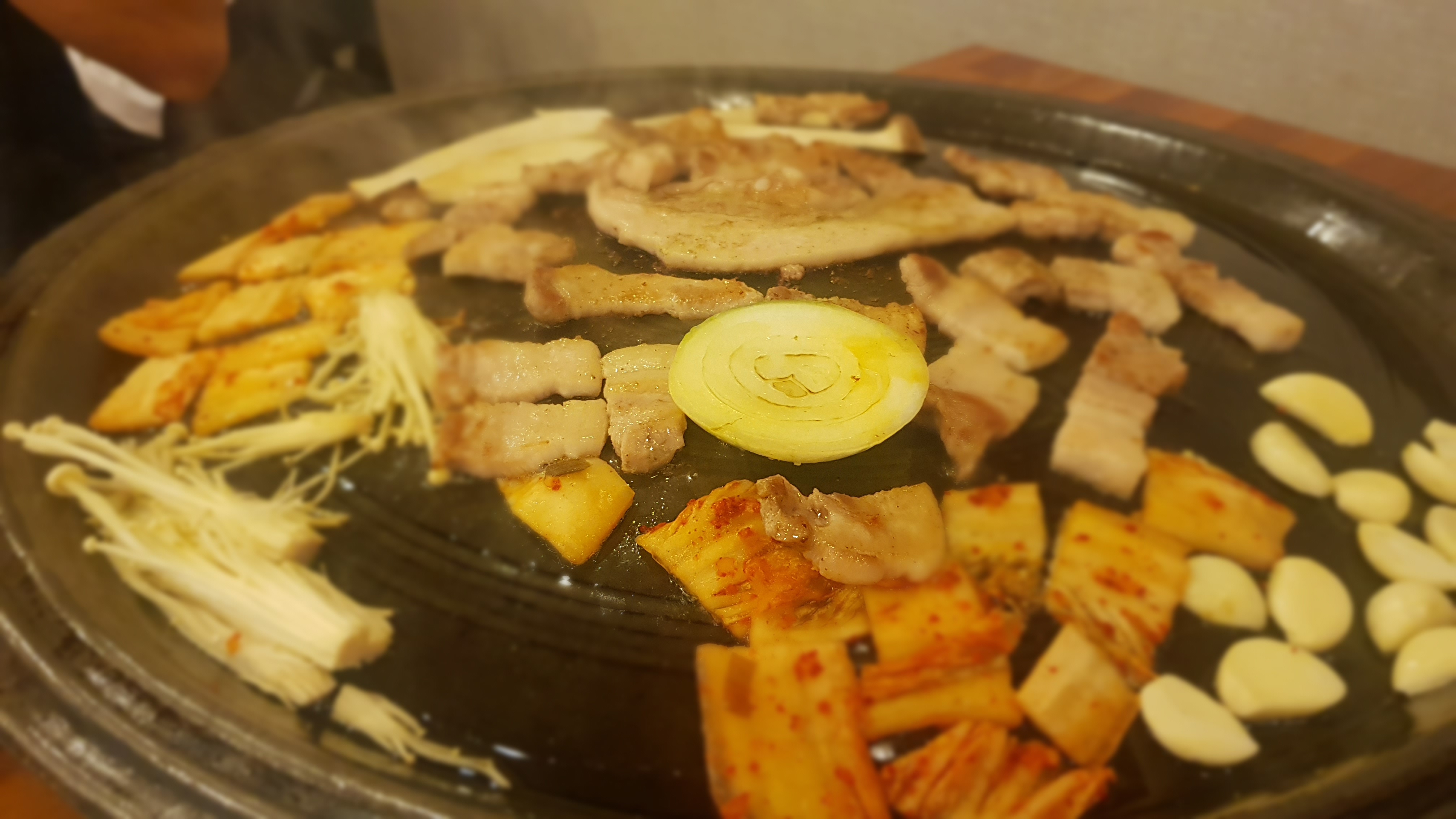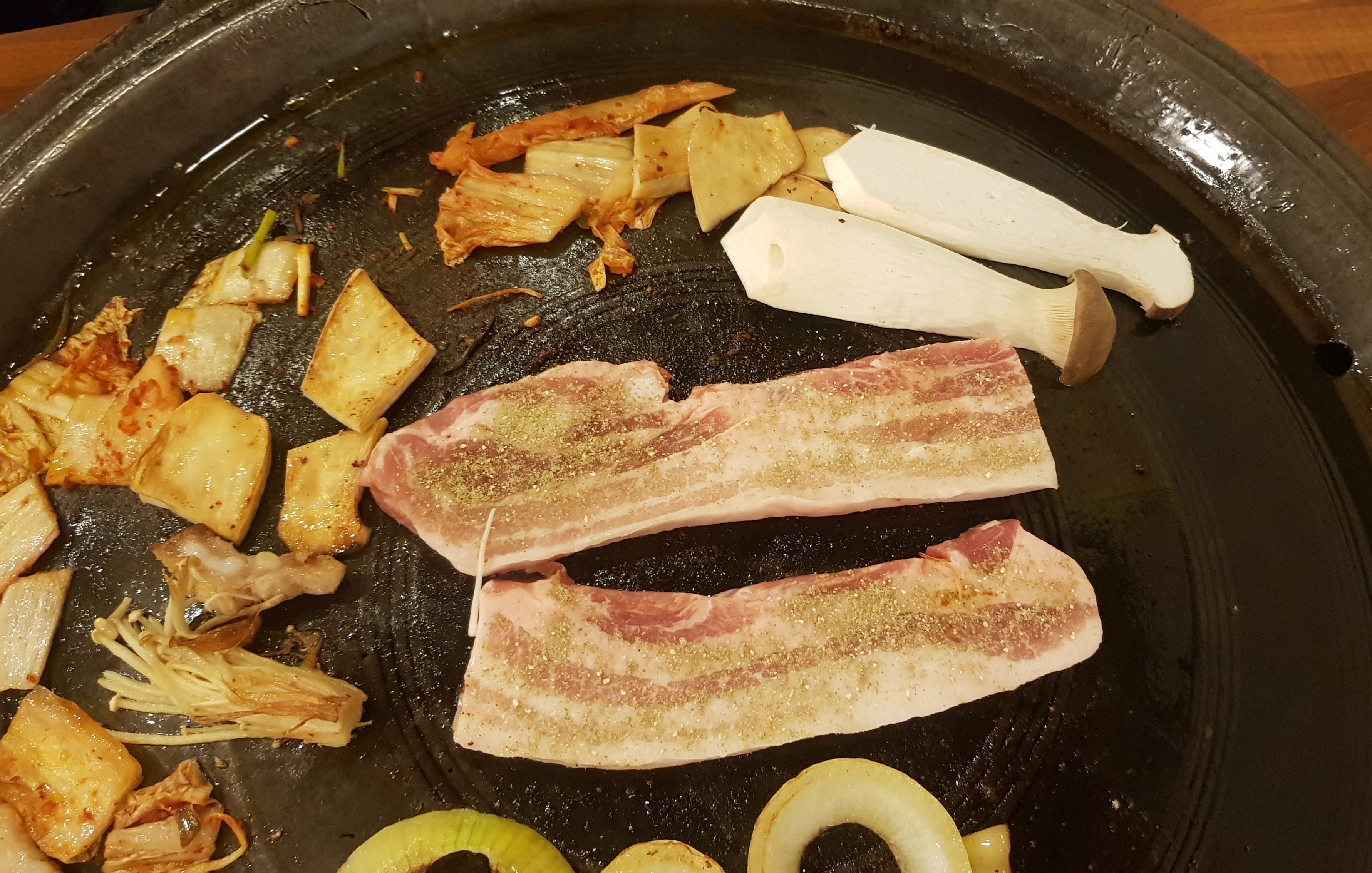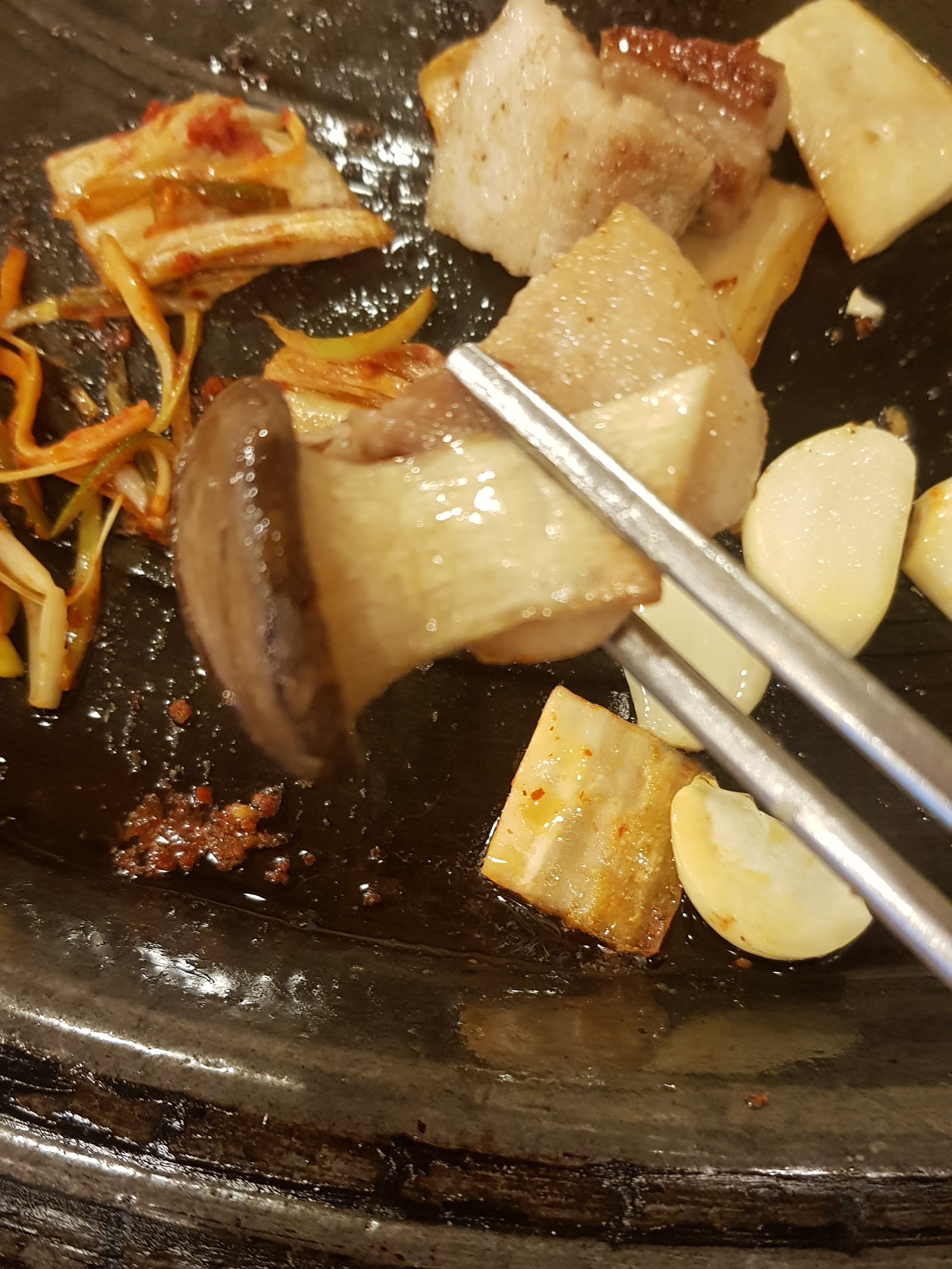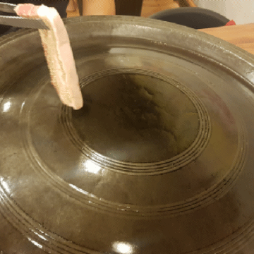 솥뚜껑은 아닌 것 같은데 솥뚜껑만큼 크고 둥근 불판에 고기를 구워 먹어요.