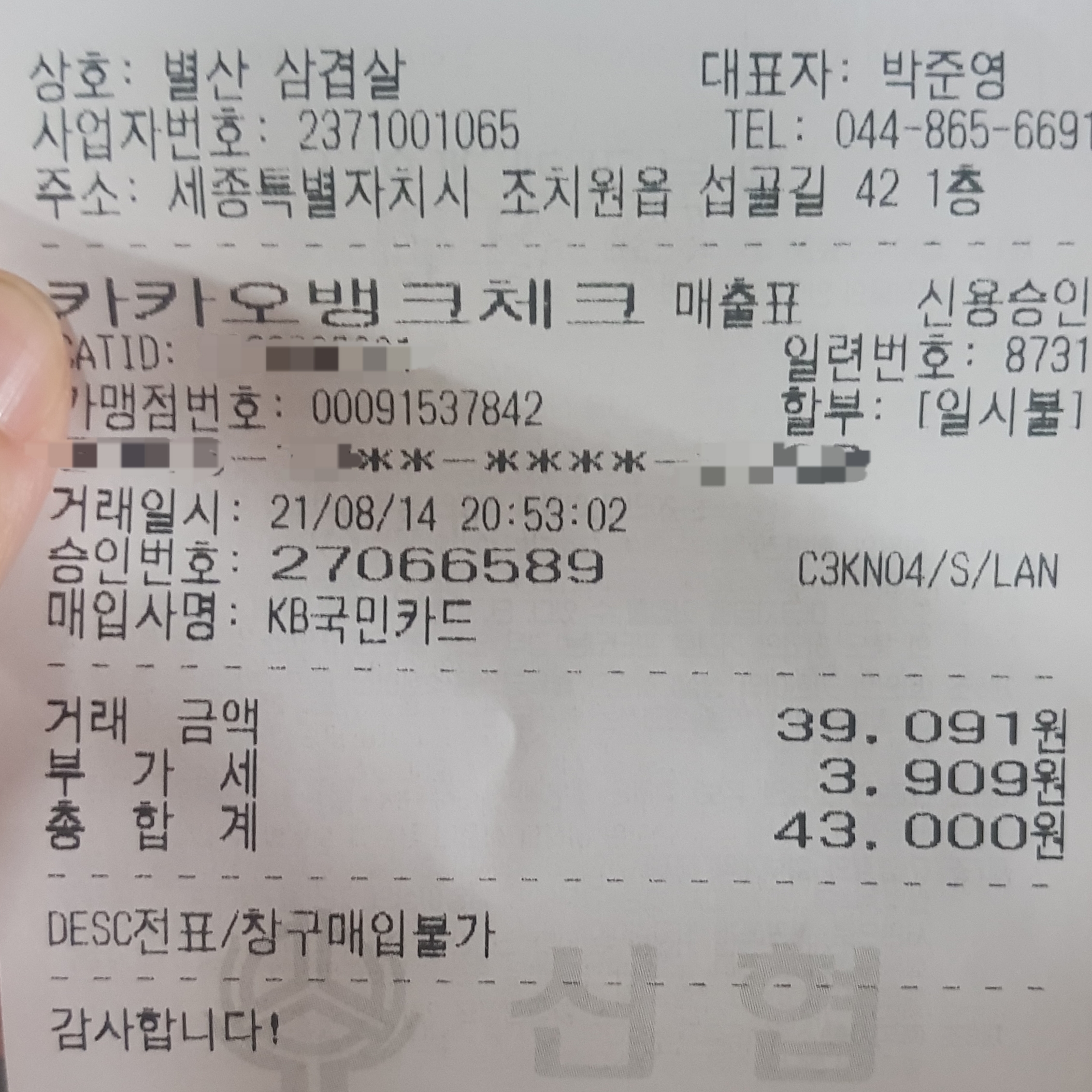 별산삼겹살(12,500원) 3인분, 볶음밥(2,000원) 2개, 음료수(1,500원) 1개, 모두 43,000원입니다.