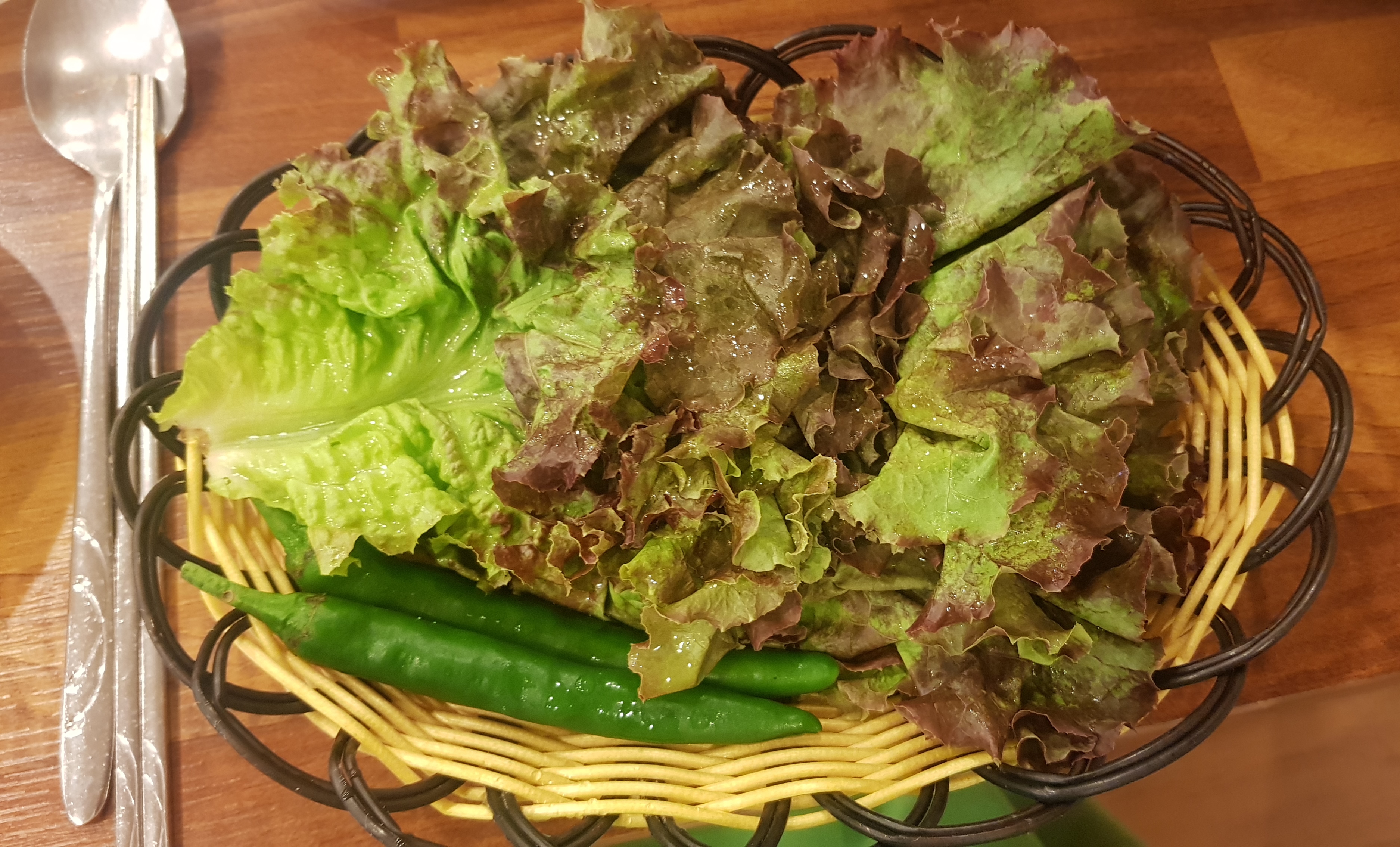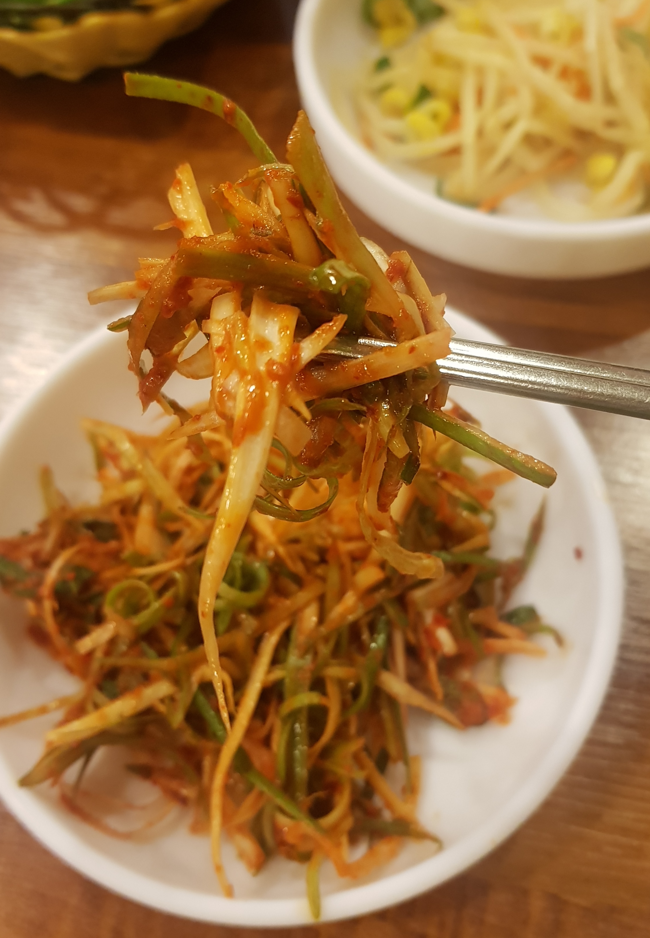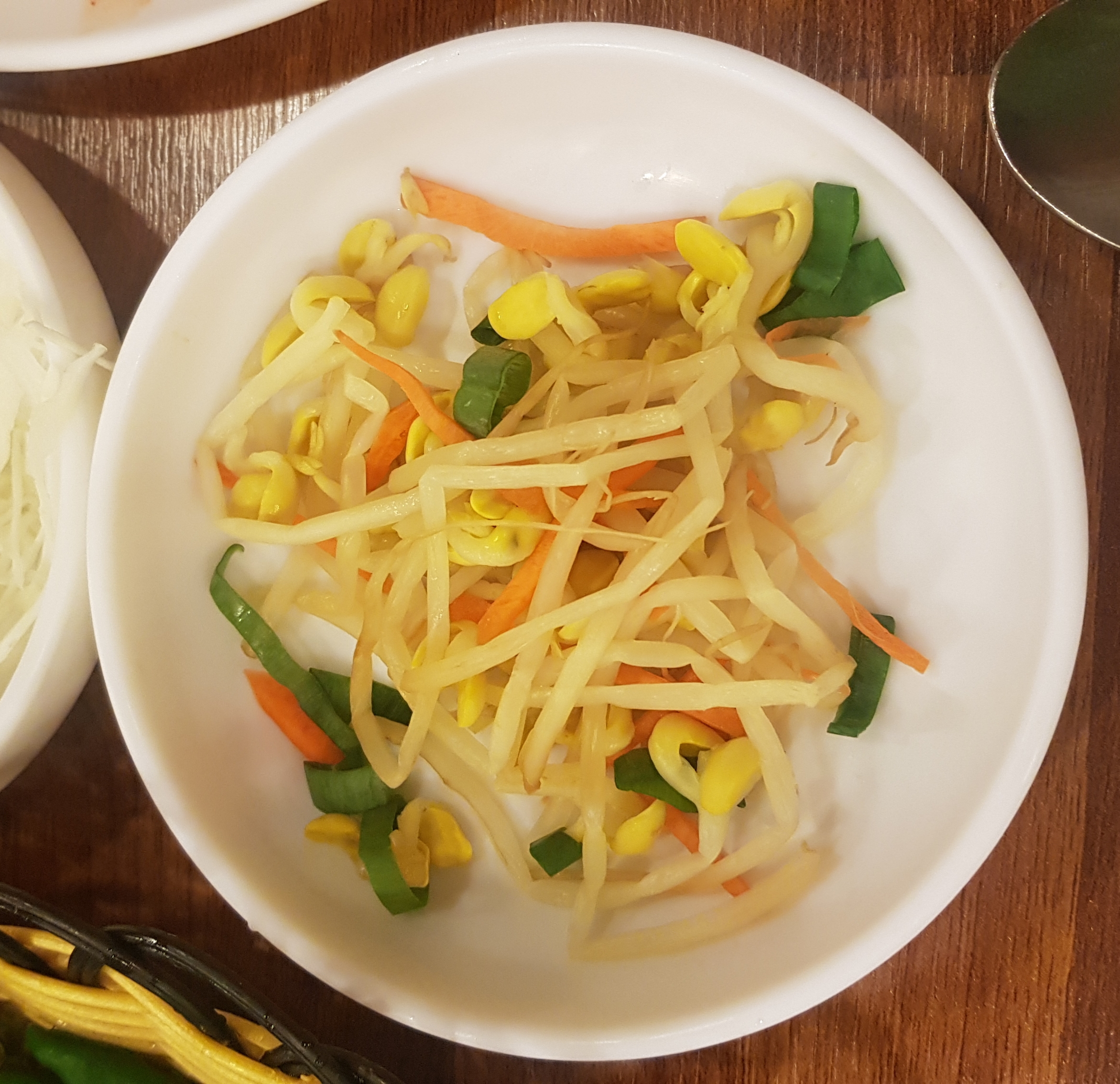 특별할 거 없는 반찬들(콩나물, 김치, 상추, 무쌈, 샐러드, 쌈장, 마늘)이 나오고
