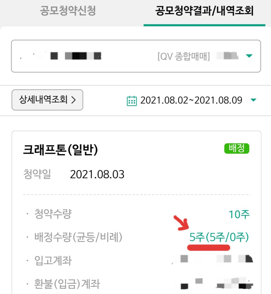 경쟁률이 저조하다더니 10주 중 균등배분만 5주나 받은 거예요.