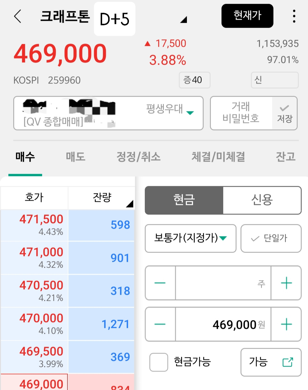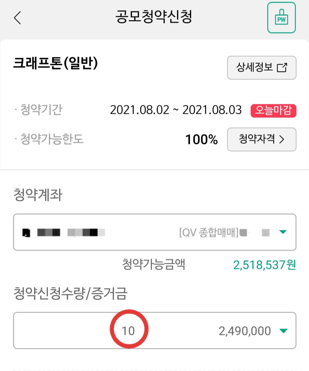 498,000원*10주 = 4,980,000원에 증거금 50%인 2,490,000원이 필요했습니다.