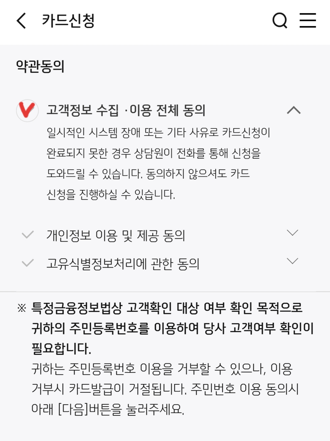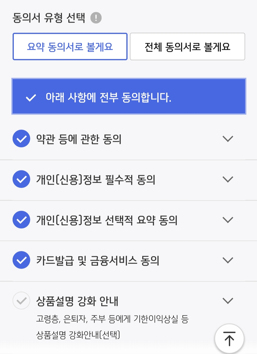 고객정보 수집에 대한 동의를 하고 카드 핵심설명서를 읽어주세요.