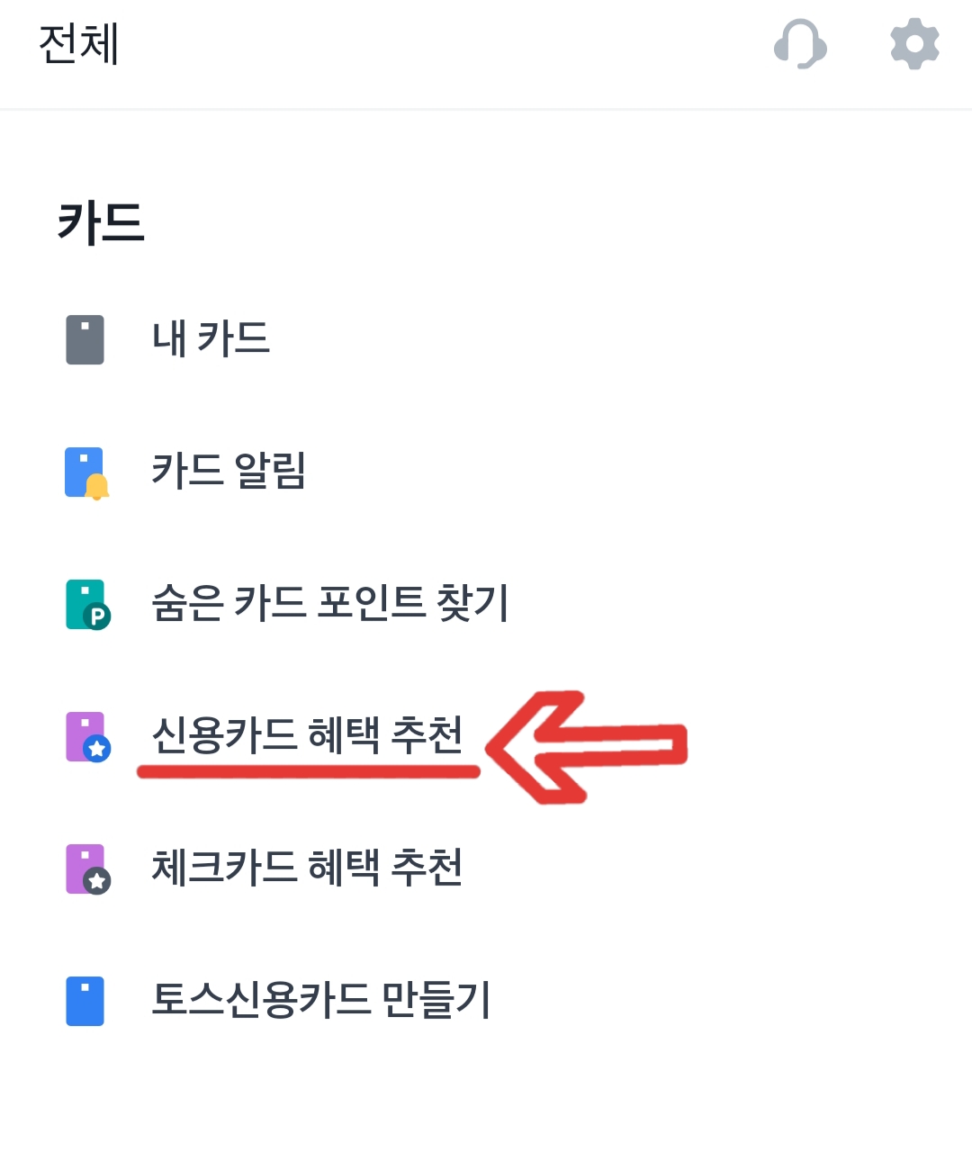 카드 메뉴에 신용카드 혜택 추천으로 들어가면