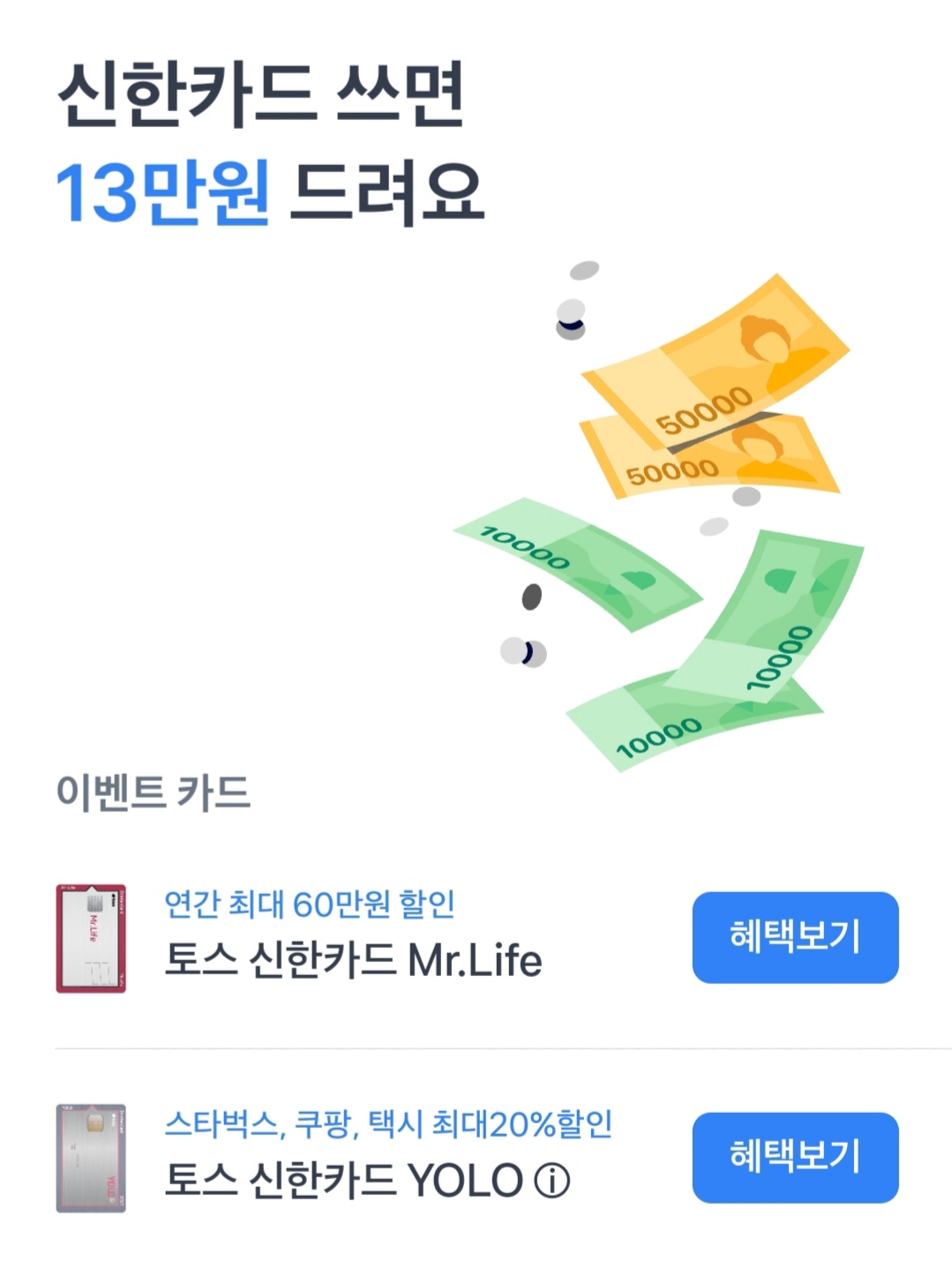 현금 13만 원 받을 수 있는 토스 신한카드 사용해 보세요.