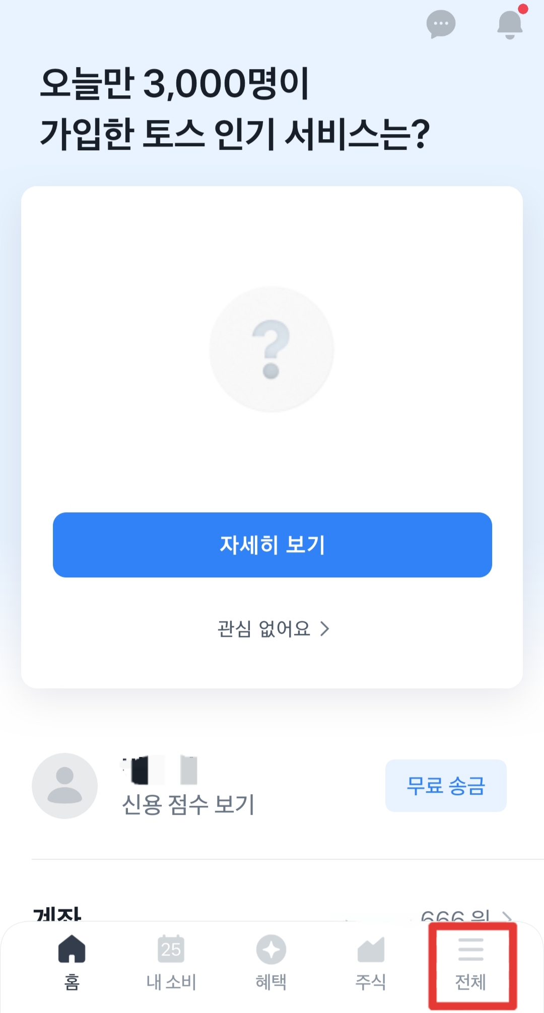 토스 앱 기본 화면에서 오른쪽 아랫부분 '전체'를 클릭해 주세요.