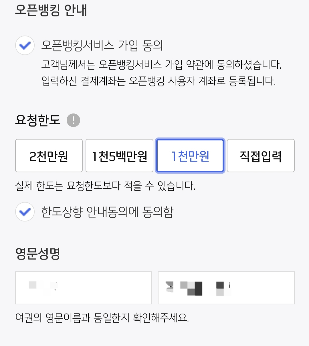 요청한도와 영문성명을 입력하고