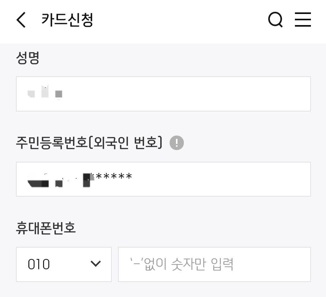 마음에 드는 카드 디자인을 선택하고 이름과 주민번호, 휴대전화 번호를 입력해요.