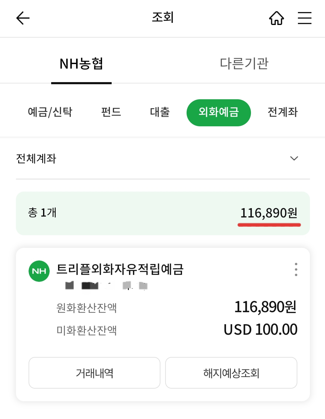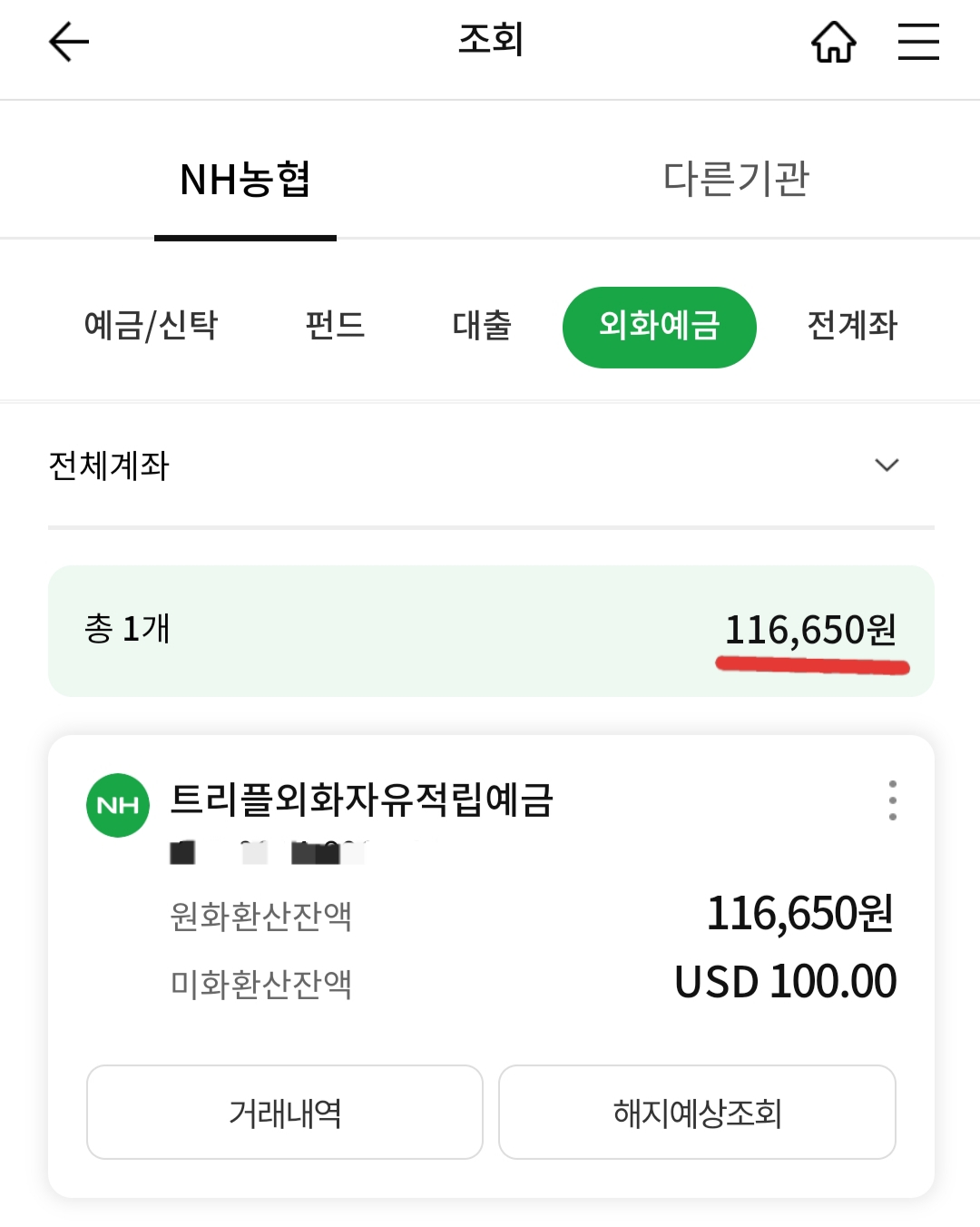 농협 앱 기본 화면에서 전 계좌 보기-외화예금을 선택하면 방금 가입한 외화통장의 잔액을 확인할 수 있습니다.
