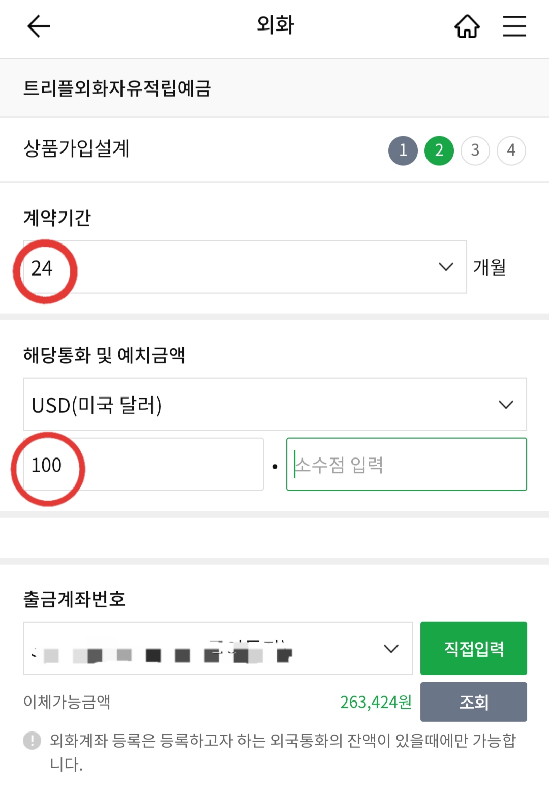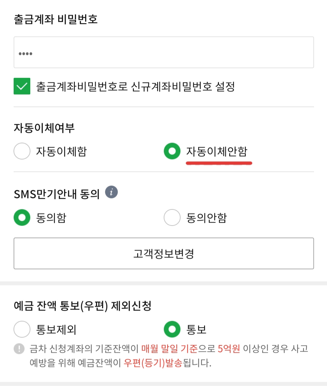 환율이 떨어질 때마다 입금을 해야 하기 때문에 자동이체도 '안 함'으로 선택해 주고요.