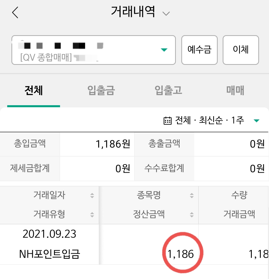 NH포인트가 예수금으로 입금되었음을 확인할 수 있습니다.