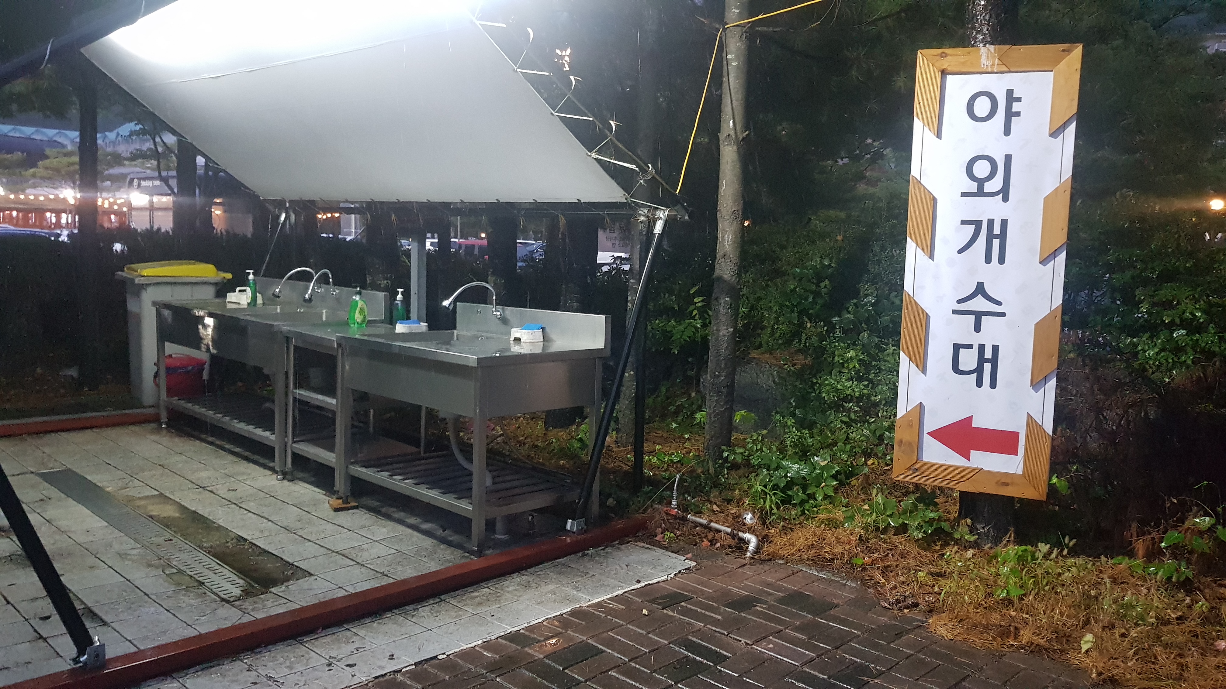 야외 개수대에서 쌈채소를 씻을 수 있고 실내에는 전자렌인지가 여러 개 준비되어 있어요.