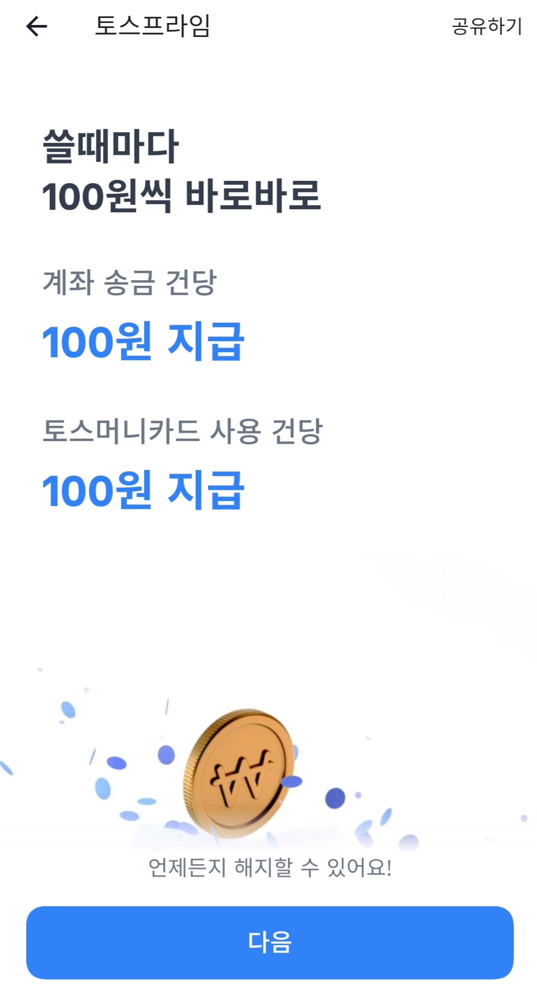 토스 프라임에 가입하면 수수료 무료에 오히려 건당 100원씩 적립해준다고 하니 이용해 보는 것도 좋을 것 같아요.