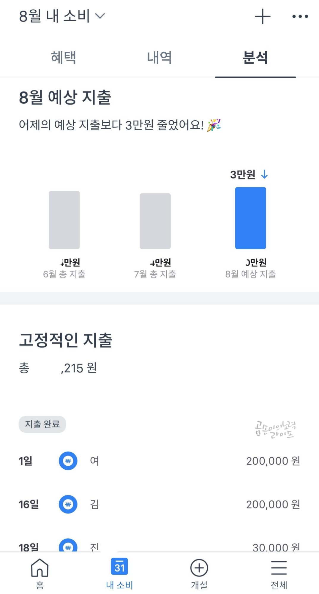 가계부를 따로 안 쓰는 분들은 토스의 소비분석을 자주 보는 것만으로도 어느 정도 불필요한 지출을 막고 통제가 가능하리라 생각됩니다.