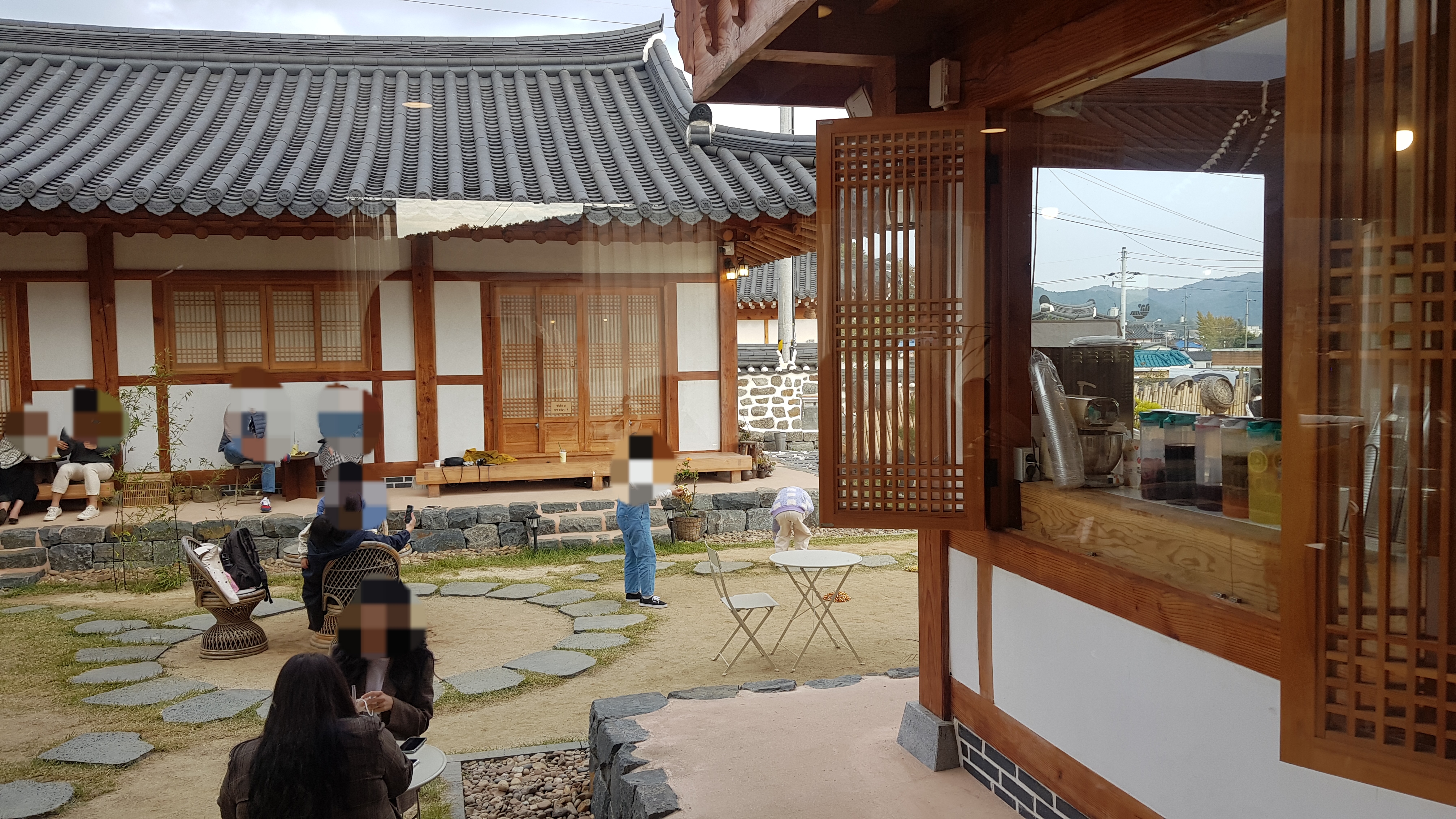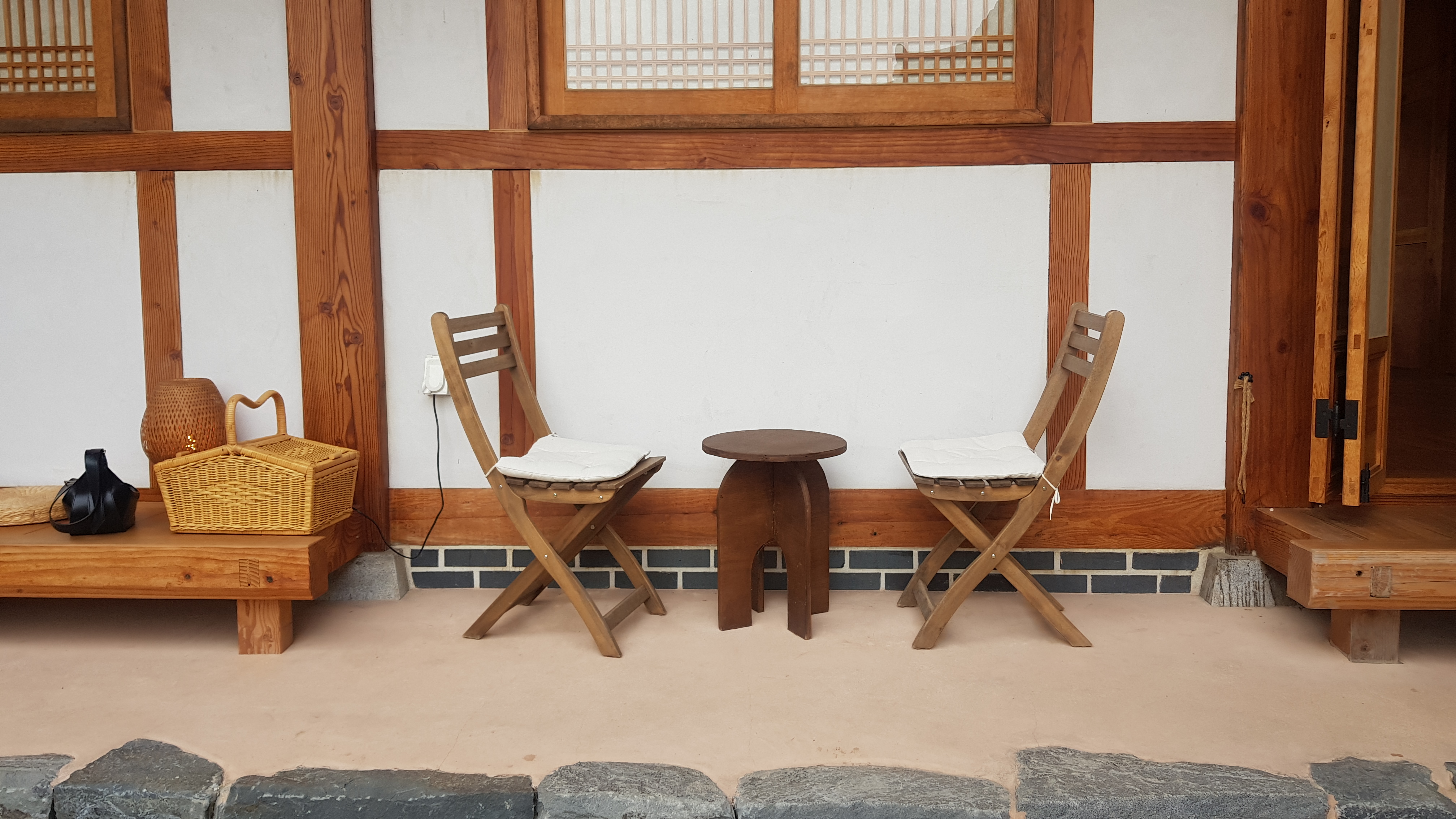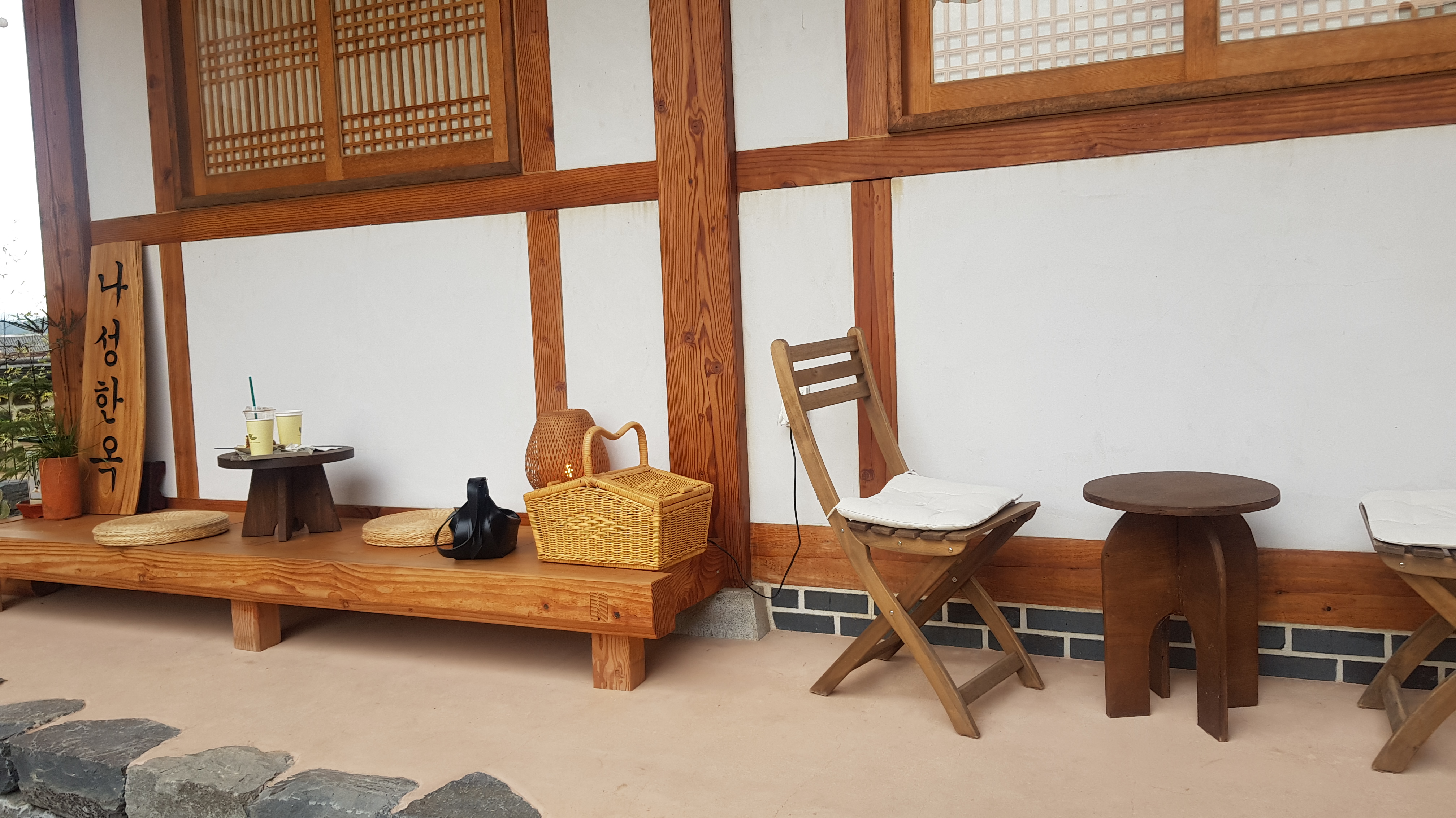 한옥 벽면에도 앉을 수 있도록 2인용 테이블이 놓여있어요.