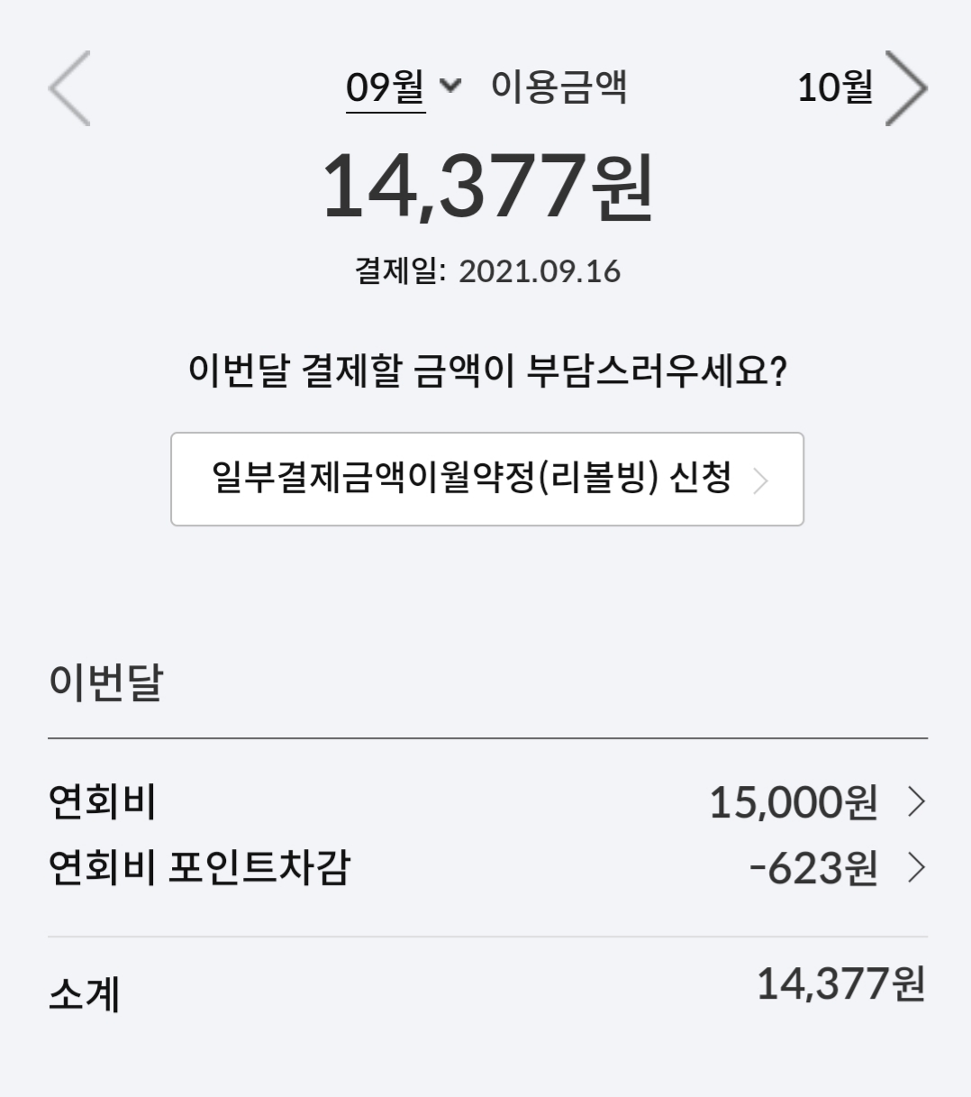 이렇게 이번 달부터 신한카드로 자동결제가 신청되었어요.