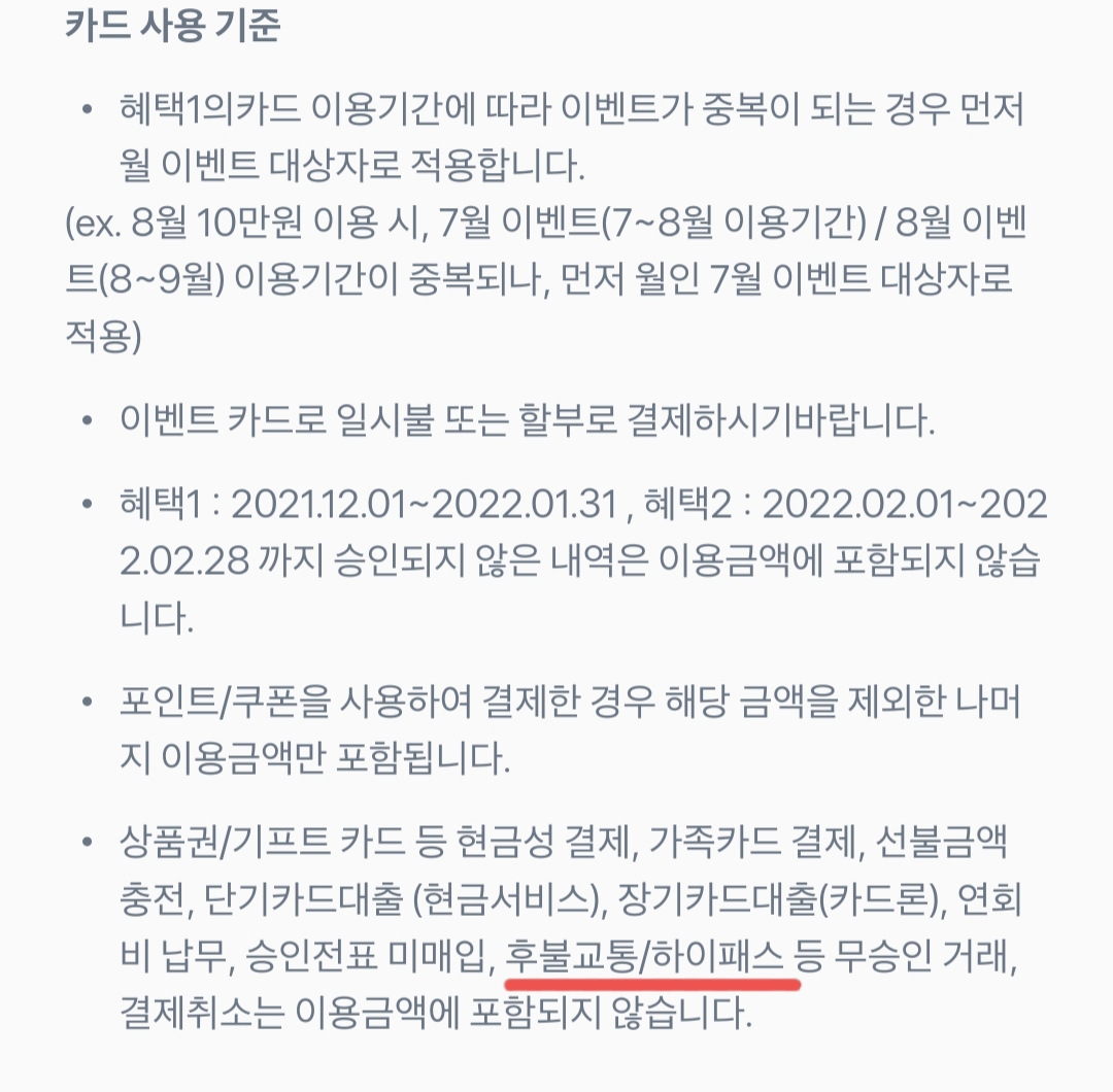 다시 보니 후불교통, 하이패스 등의 무승인 거래는 이용금액에 포함되지 않는다는 내용이 명시되어 있더라고요.
