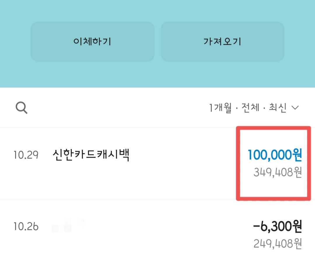 약속한 날짜에 신한카드에서 10만 원이 입금되었고 바로 주식계좌에 넣어서 투자했어요.
