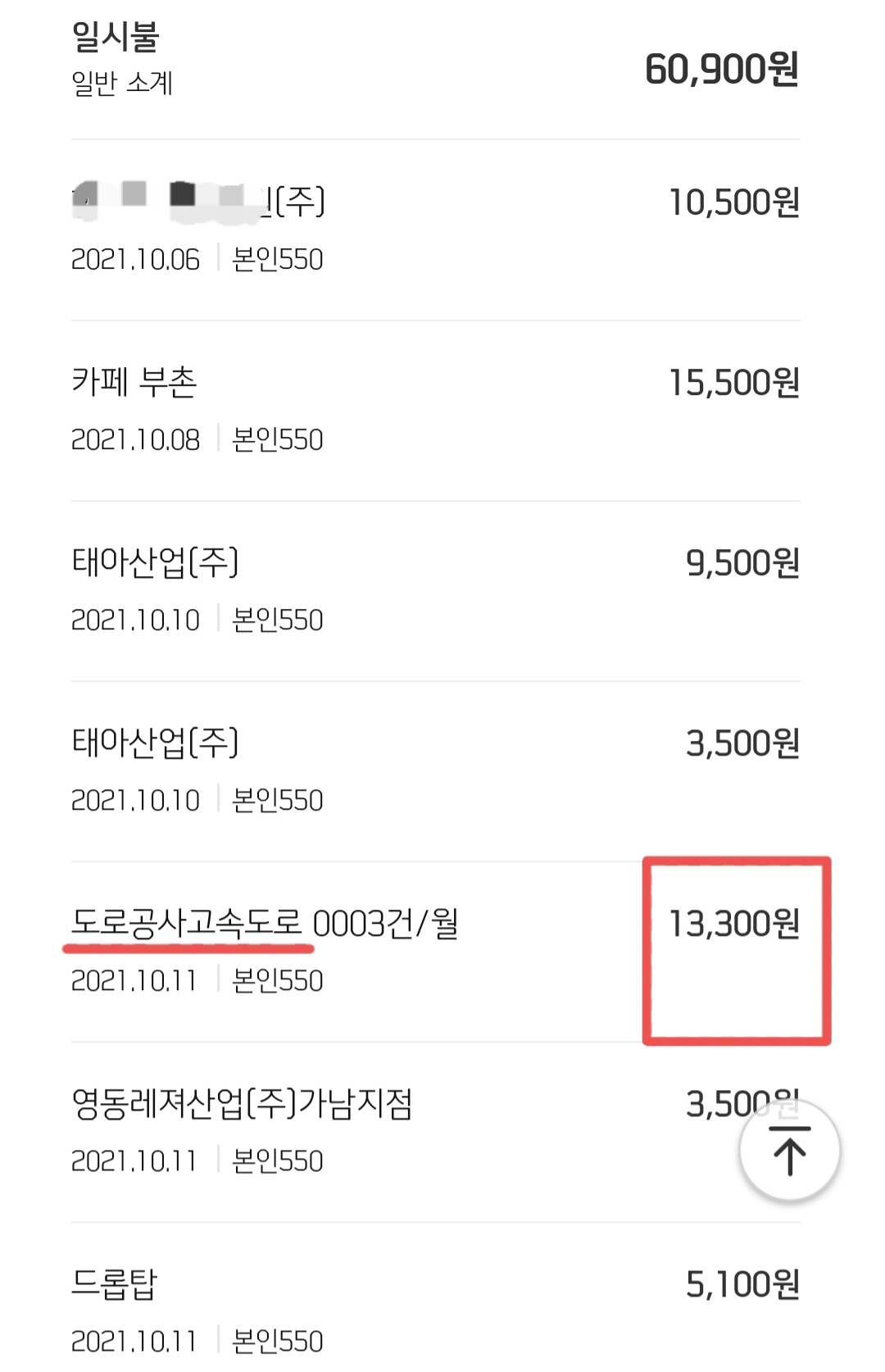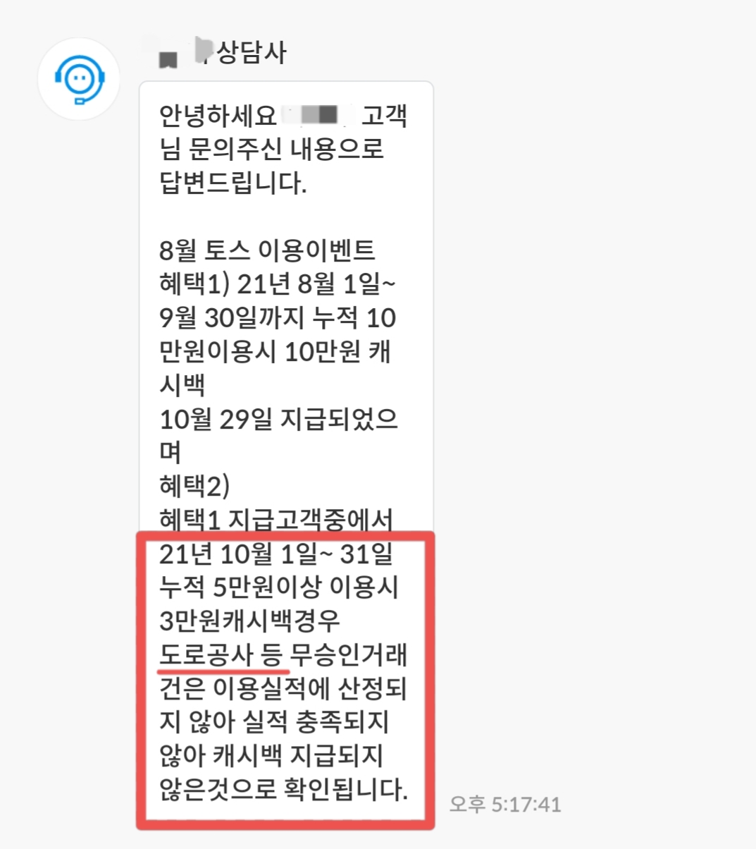 도로공사 결제 건은 실적에 포함되지 않아 캐시백이 지급되지 않았다는 답변을 받았어요.
