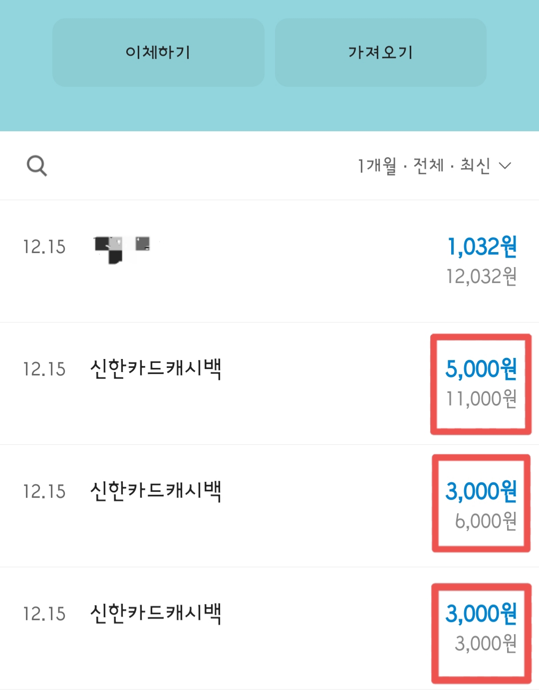 무슨 이유에서인지 캐시백이 3번, 총 11,000원이나 들어왔어요.