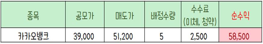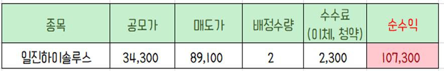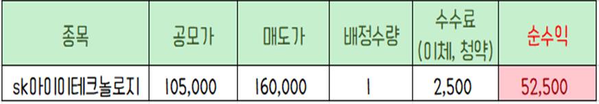 이 종목 역시 단 1주 배정받았지만 수수료를 제하고도 5만 원이 넘는 수익을 거두었어요.