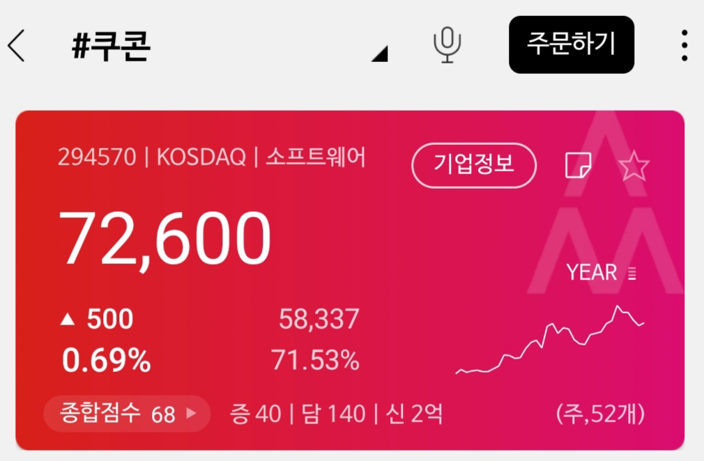 쿠콘은 현재 꾸준히 상승세를 타고 있고 나쁘지 않은 가격대에서 거래되고 있었어요.
