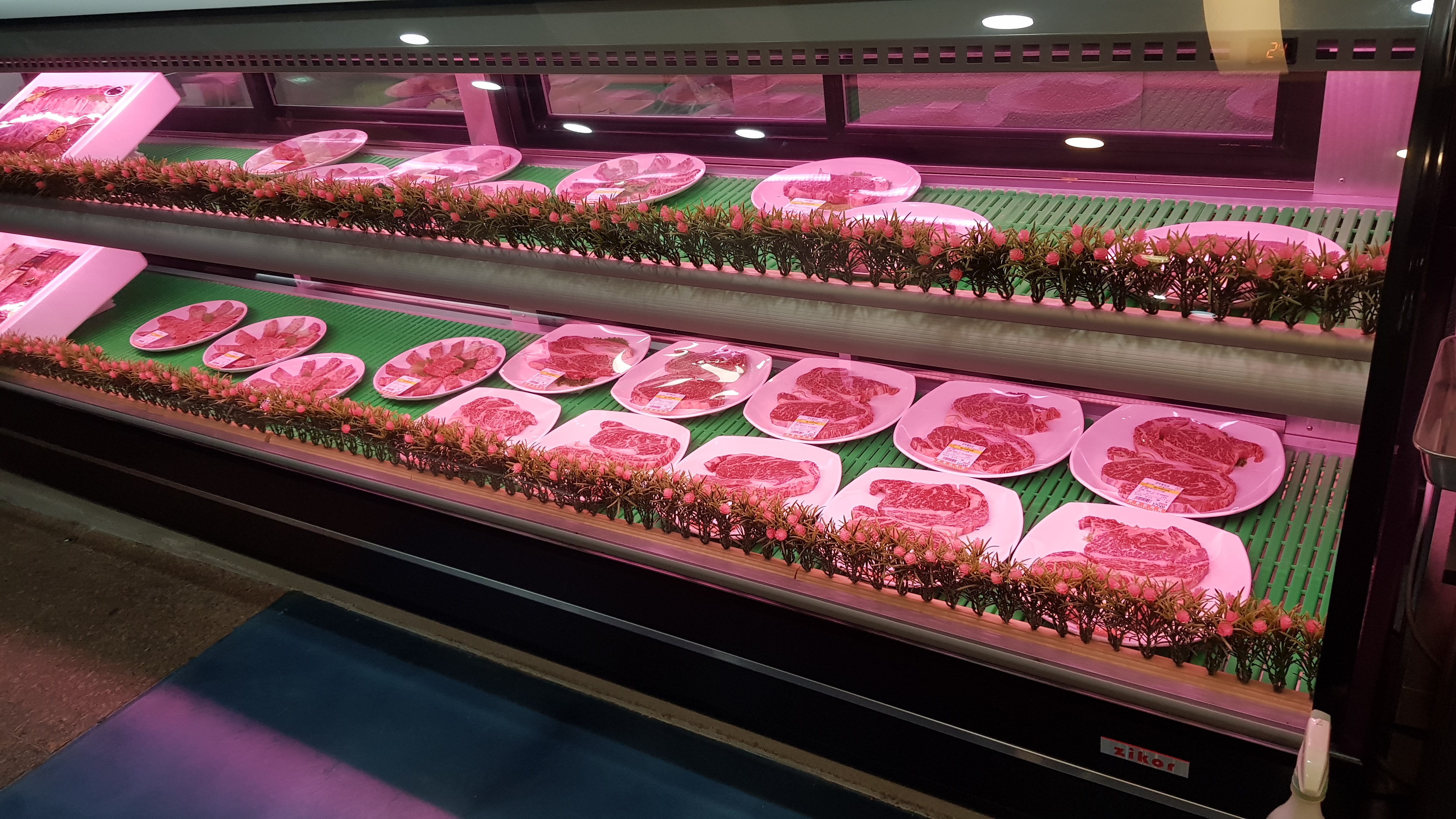 입구에 들어서면 바로 있는 정육점에서 고기를 골라 계산하고 식당 안으로 들어가면 돼요.