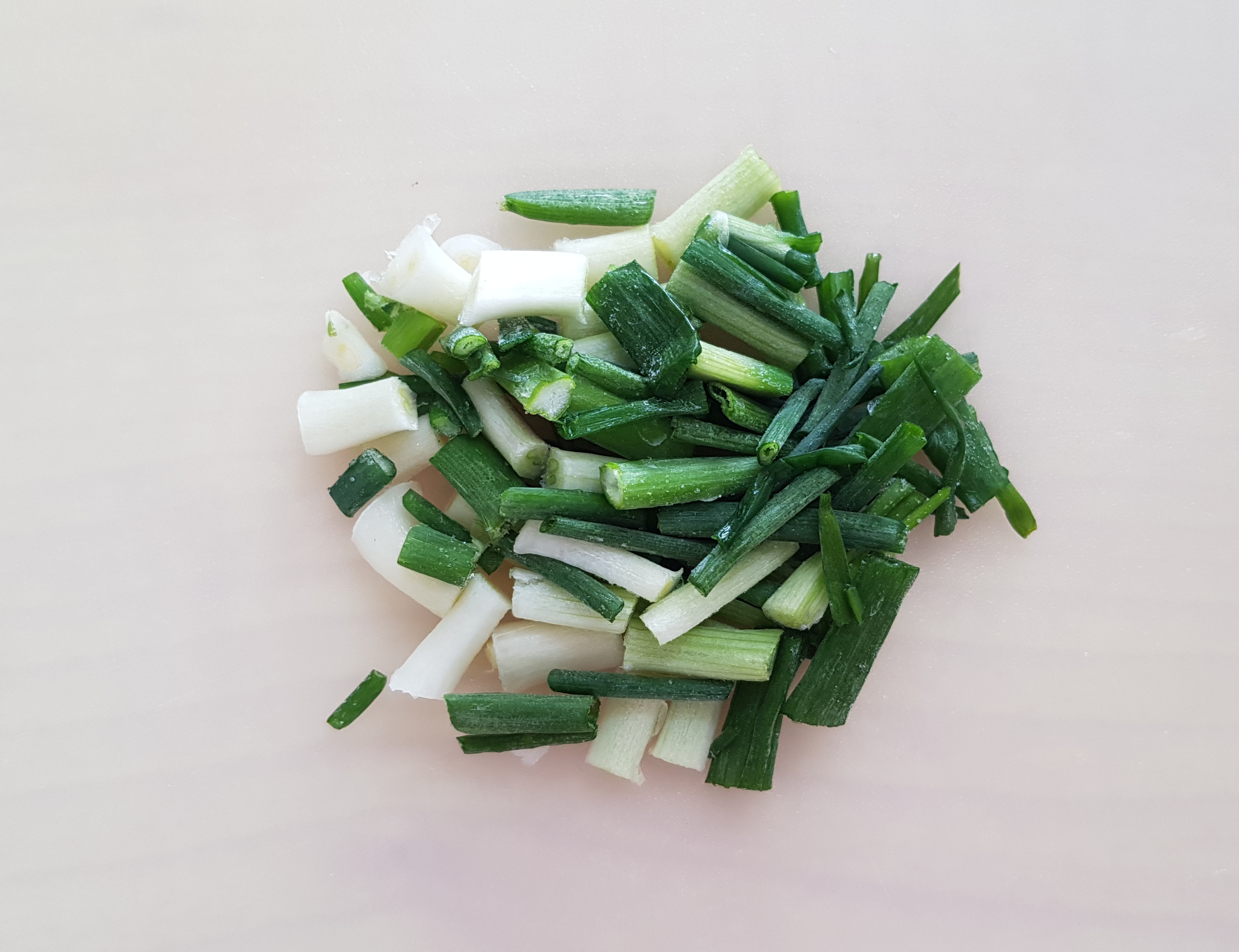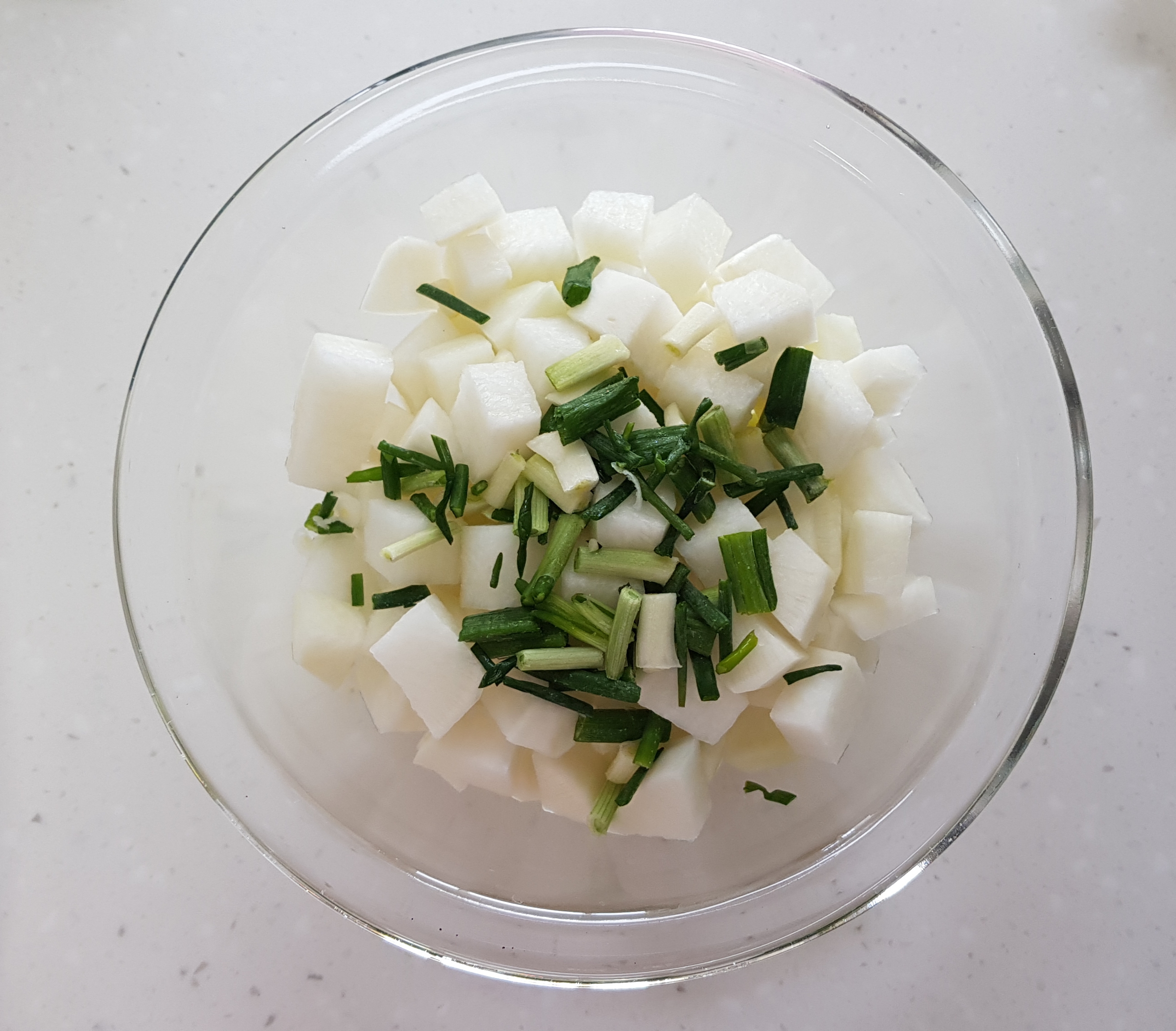 쪽파도 1~2cm 길이로 썰어서 무와 함께 볼에 바로 담아주세요.