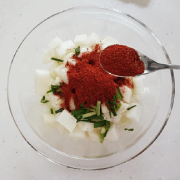 무와 쪽파를 담은 볼에 양념을 만들어서 바로 버무릴 거예요.