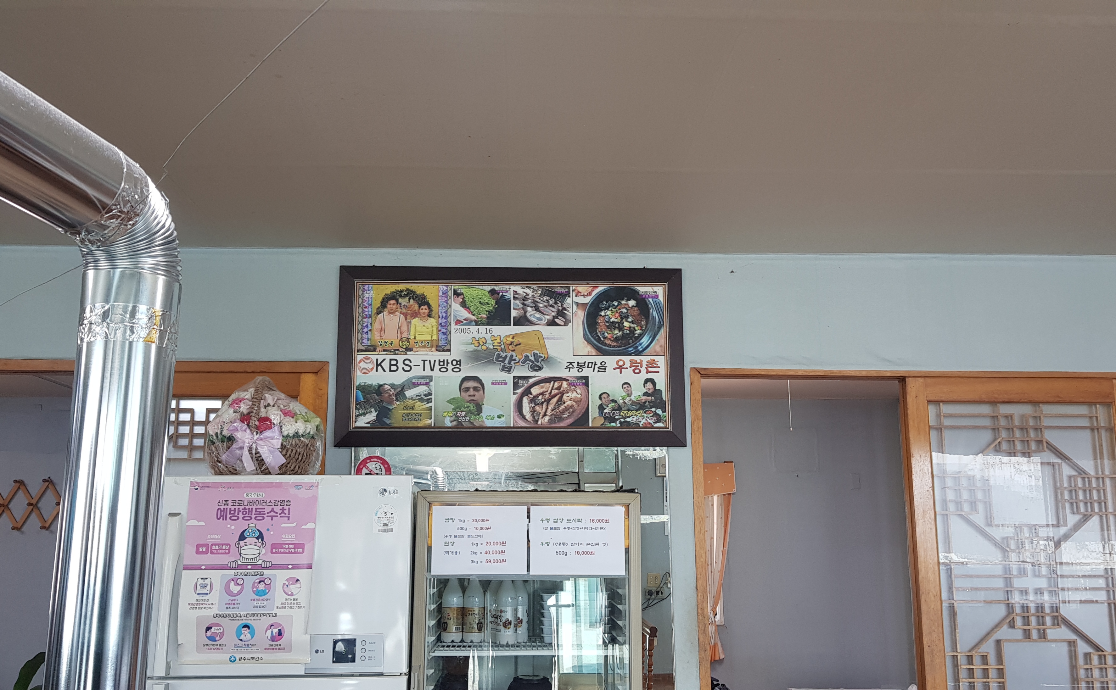 우렁쌈장 쌈밥 9,000원 3인분, 돼지갈비 11,000원 1인분, 모두 38,000원 정도예요.