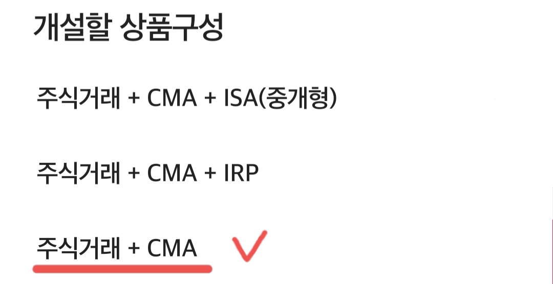 그래서 저는 가장 아랫 칸에 주식거래+CMA로 선택하였습니다.