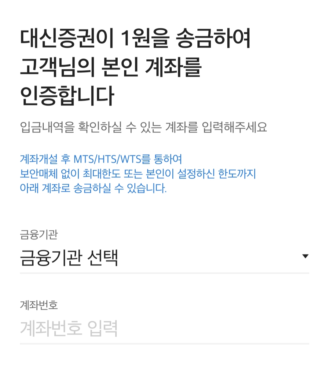 마지막으로 계좌인증을 해요.계좌인증은 직접 입력한 은행 계좌에 대신증권이 1원을 송금해 주고 내역에 찍힌 숫자를 입력하는 방법이에요.