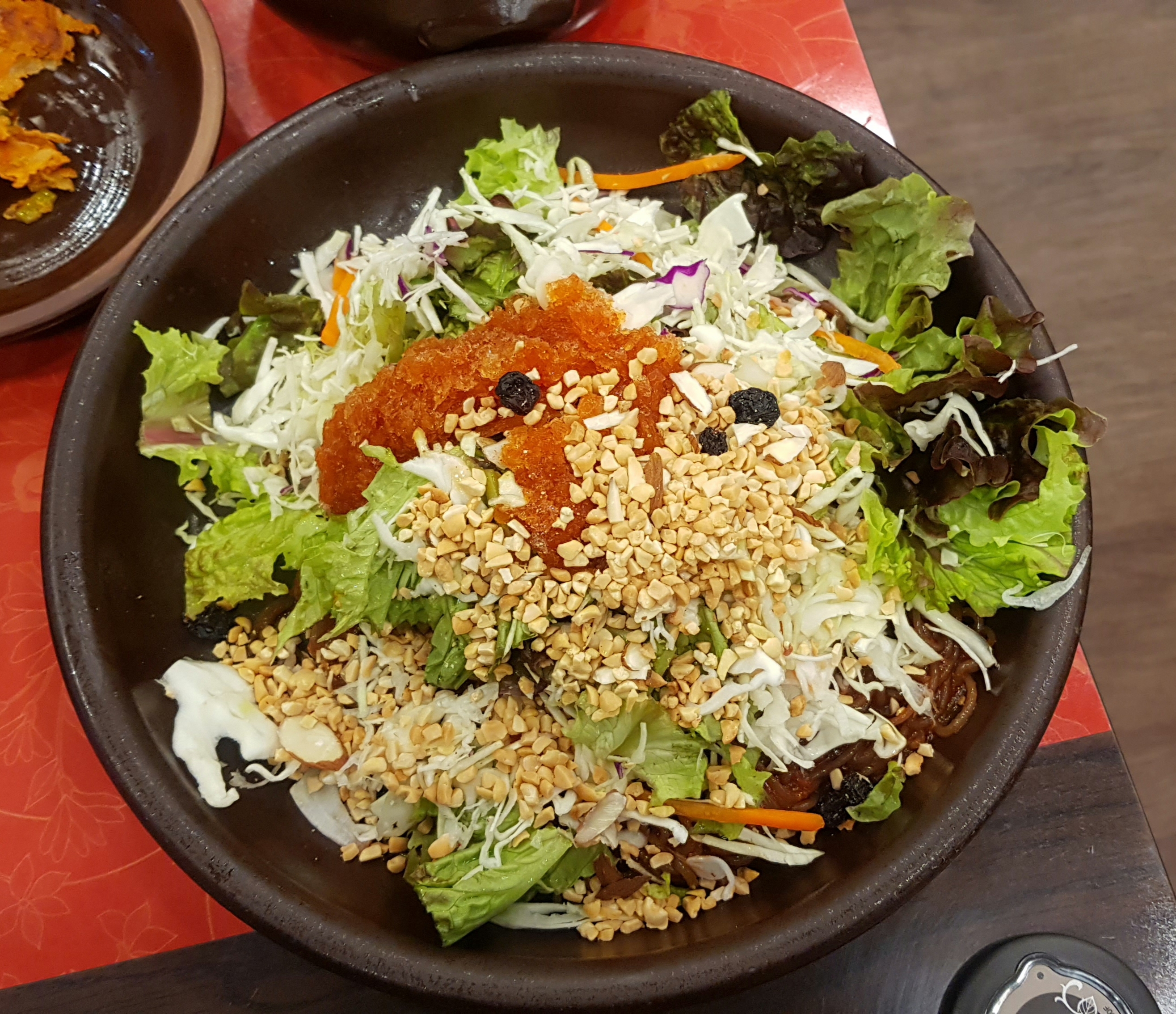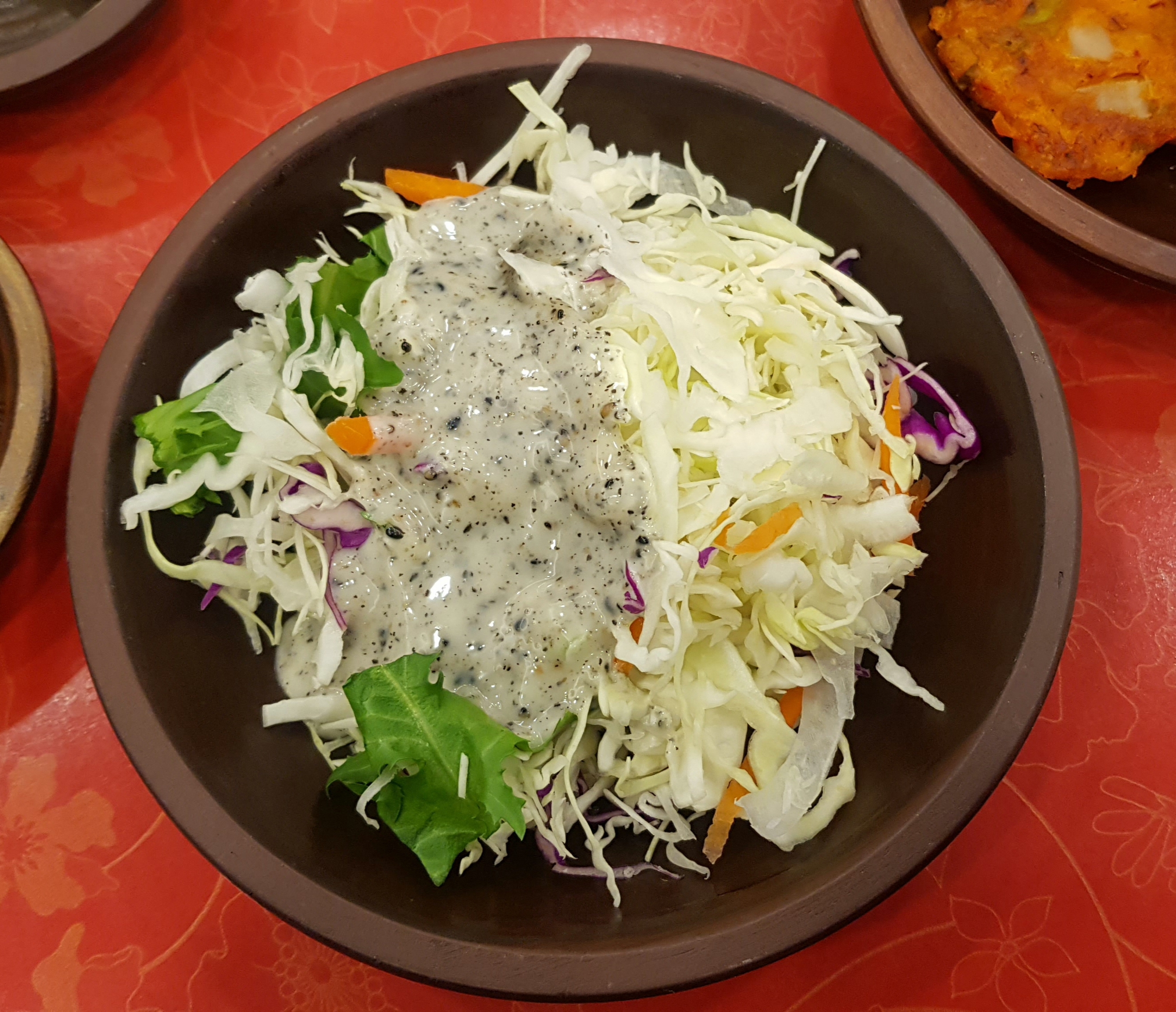 반찬으로는 상추, 샐러드, 김치전 등이 나와요.