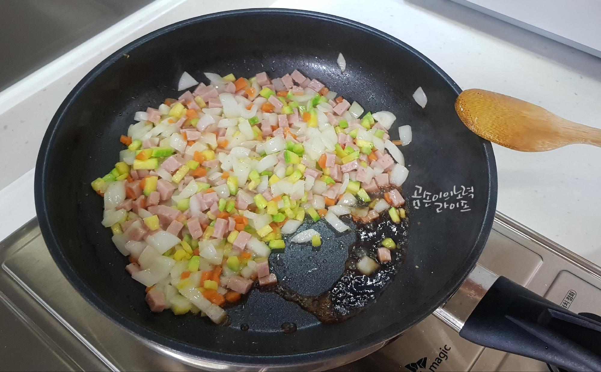 채소와 햄을 한 번에 다 넣었다면 센 불에서 볶아주세요.