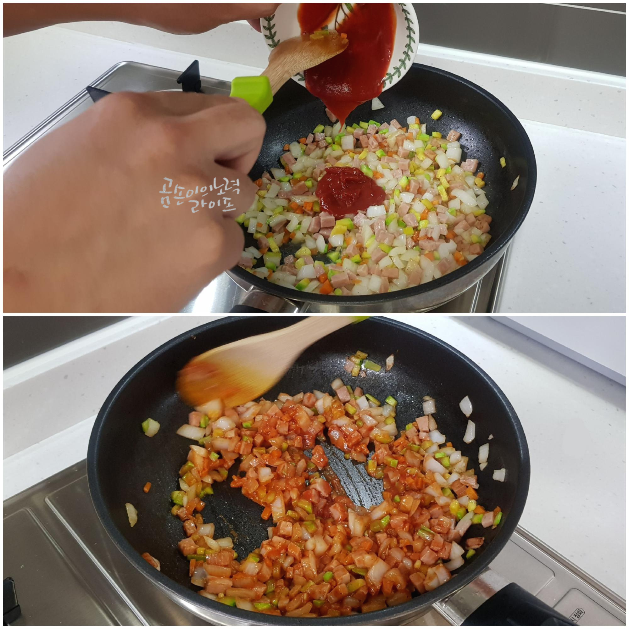 다음으로 케첩을 넣고 고루 섞일 때까지 볶아주세요.