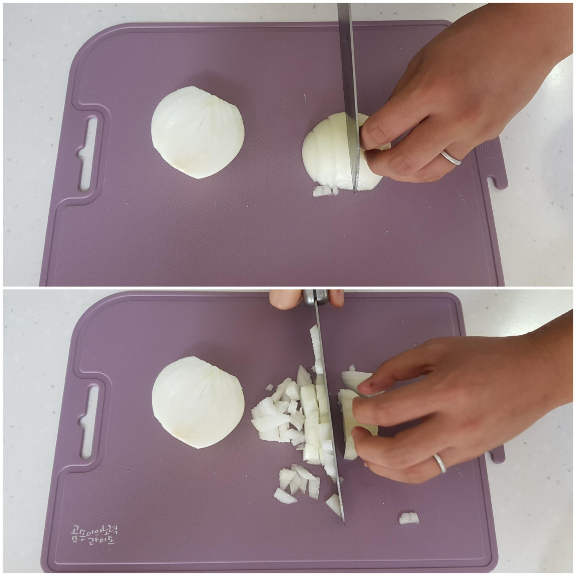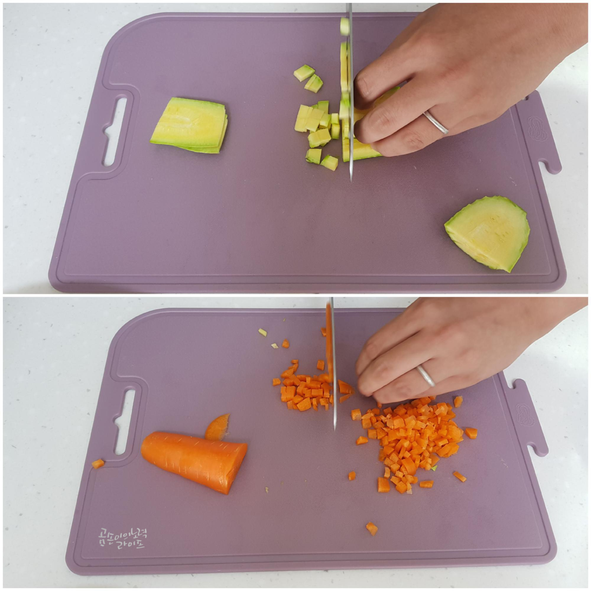 식감과 색감을 살려주는 양파와 당근, 애호박을 다지듯이 잘게 썰어주세요.