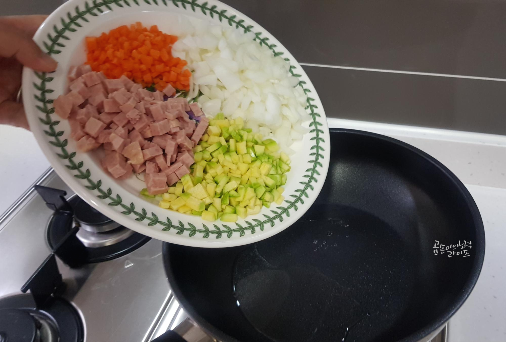 여기까지 오므라이스에 들어갈 볶음밥 완성입니다.