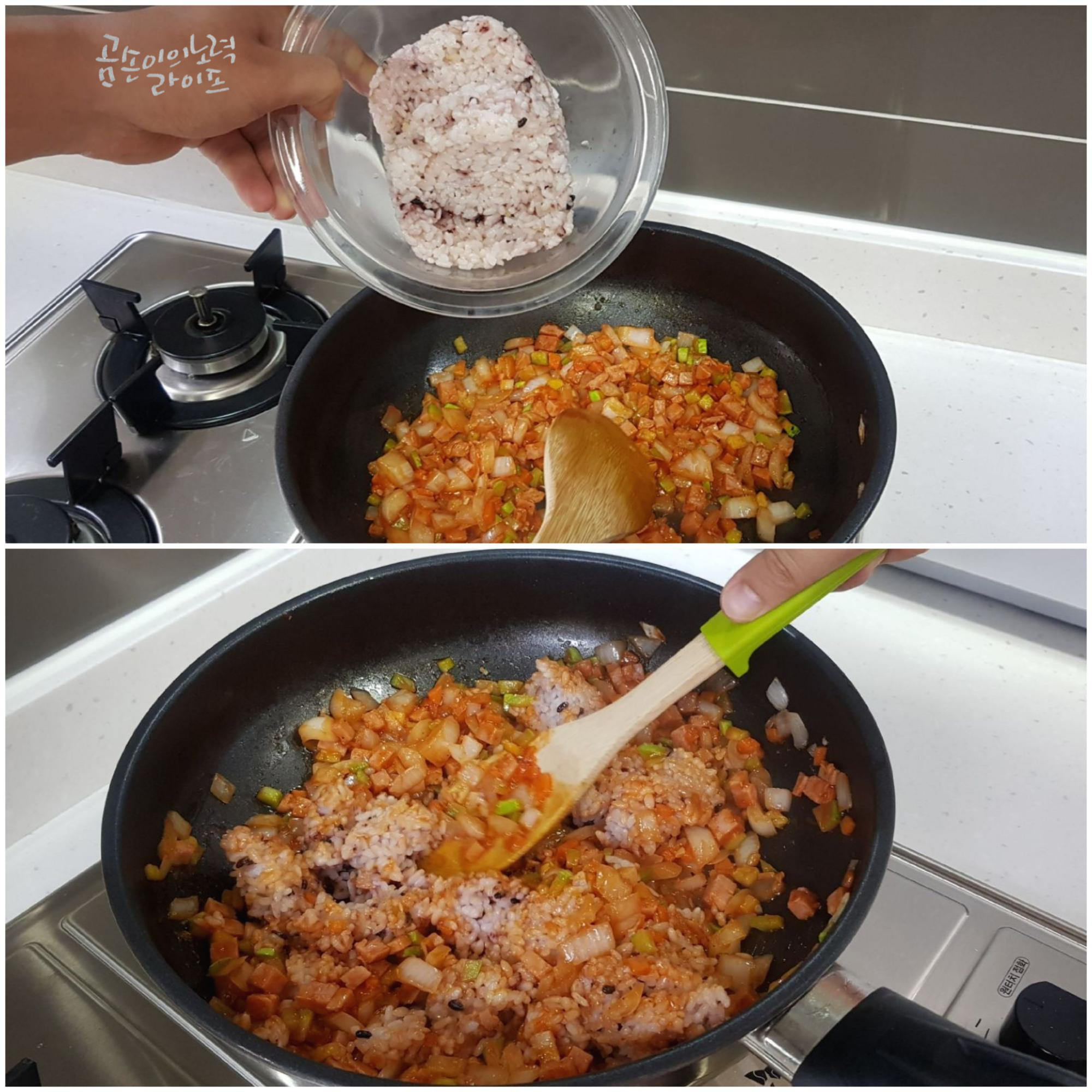 또 한 가지 꿀팁이 있다면 주걱을 세로로 세워서 콕콕 눌러주면 밥이 뭉치지 않게 골고루 볶아줄 수 있어요.
