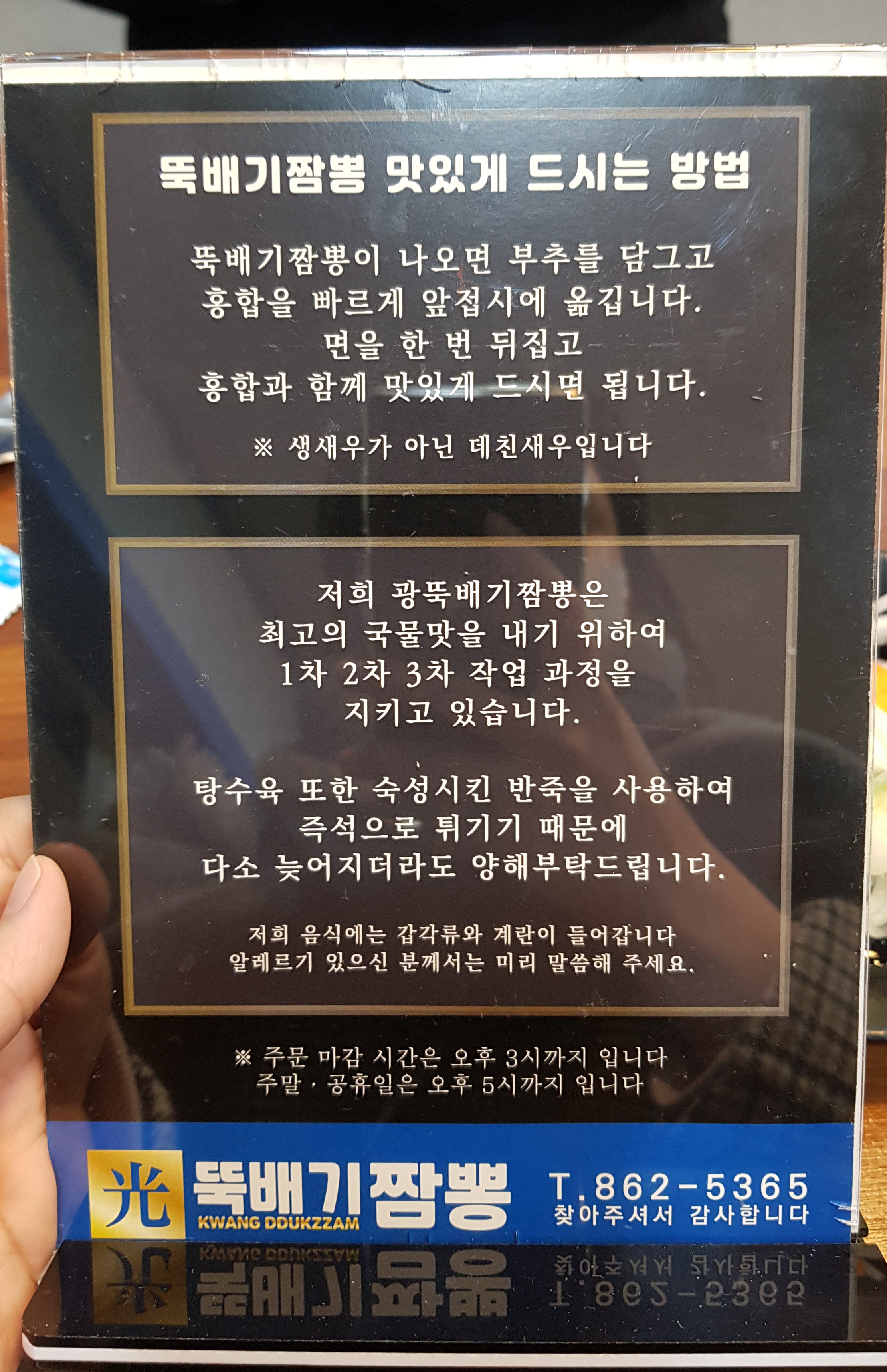 뚝배기짬뽕 맛있게 먹는 방법도 나와있어요.지난번 방문했을 때, 양이 엄청 푸짐하고 맛있었던 기억이 나서 오늘도 뚝배기짬뽕과 미니 탕수육을 주문했지만 다음에 오면 우육탕면도 꼭 먹어보려고요😀