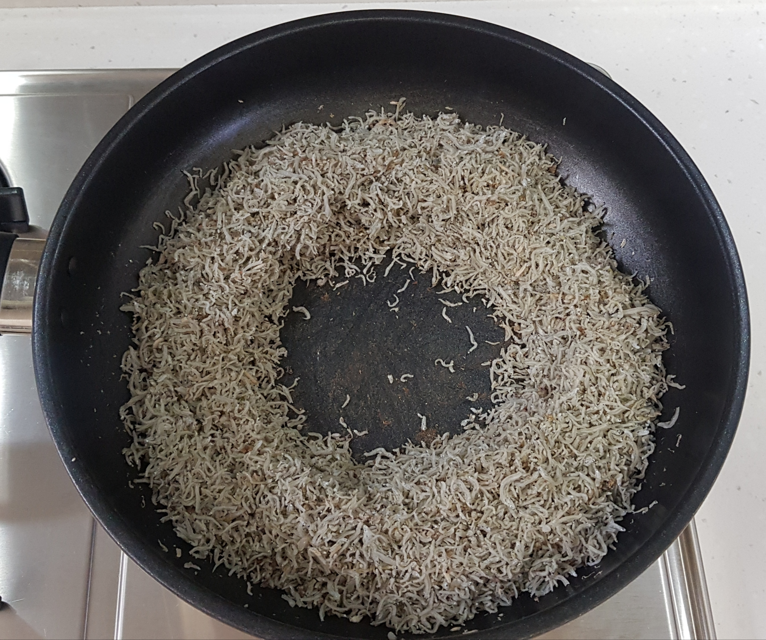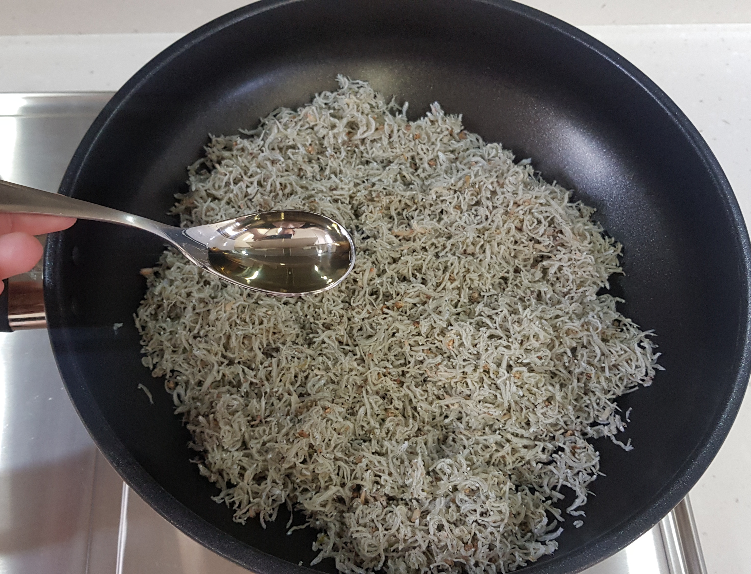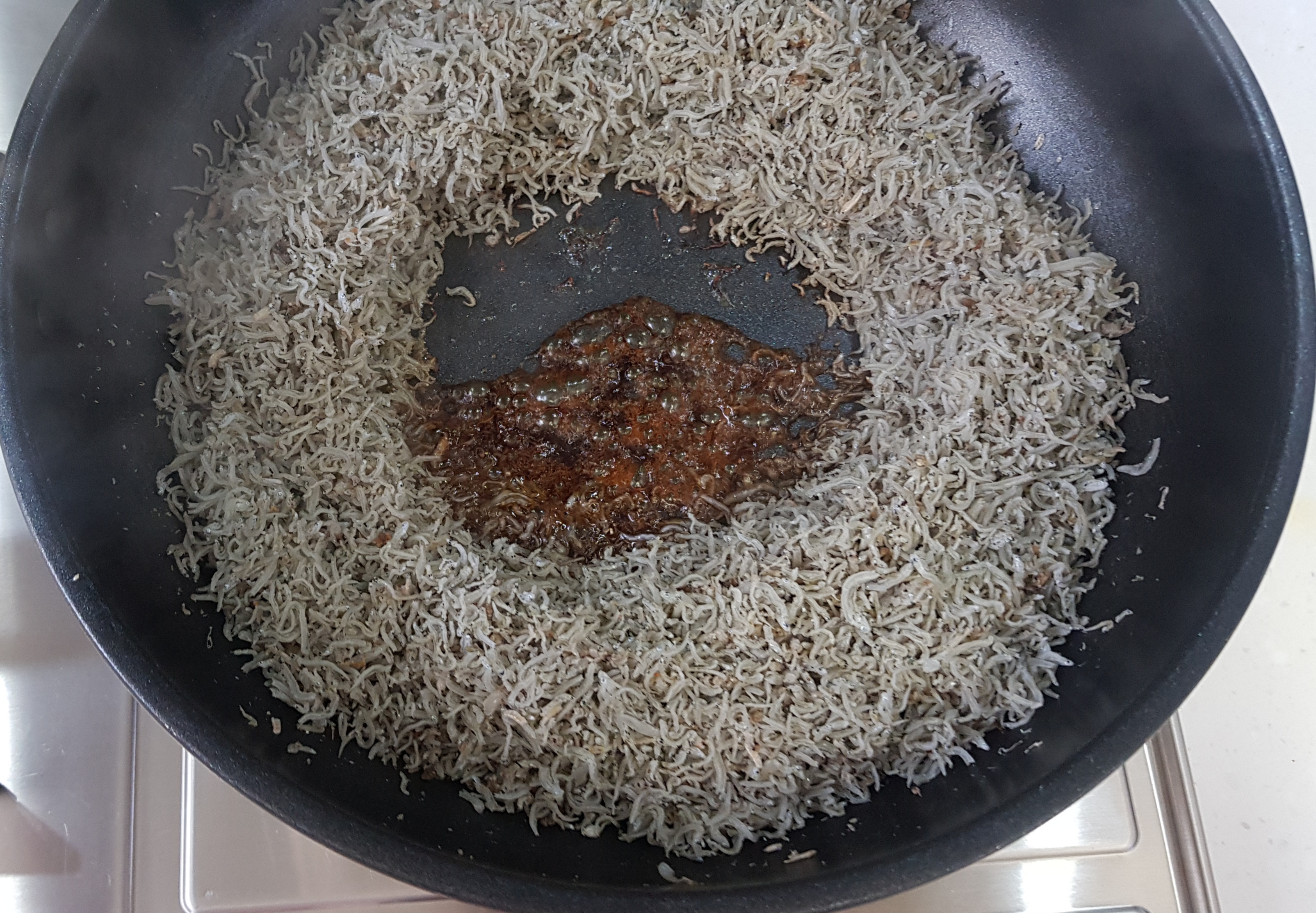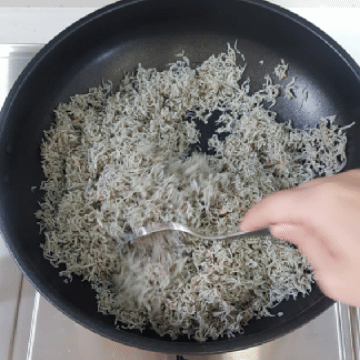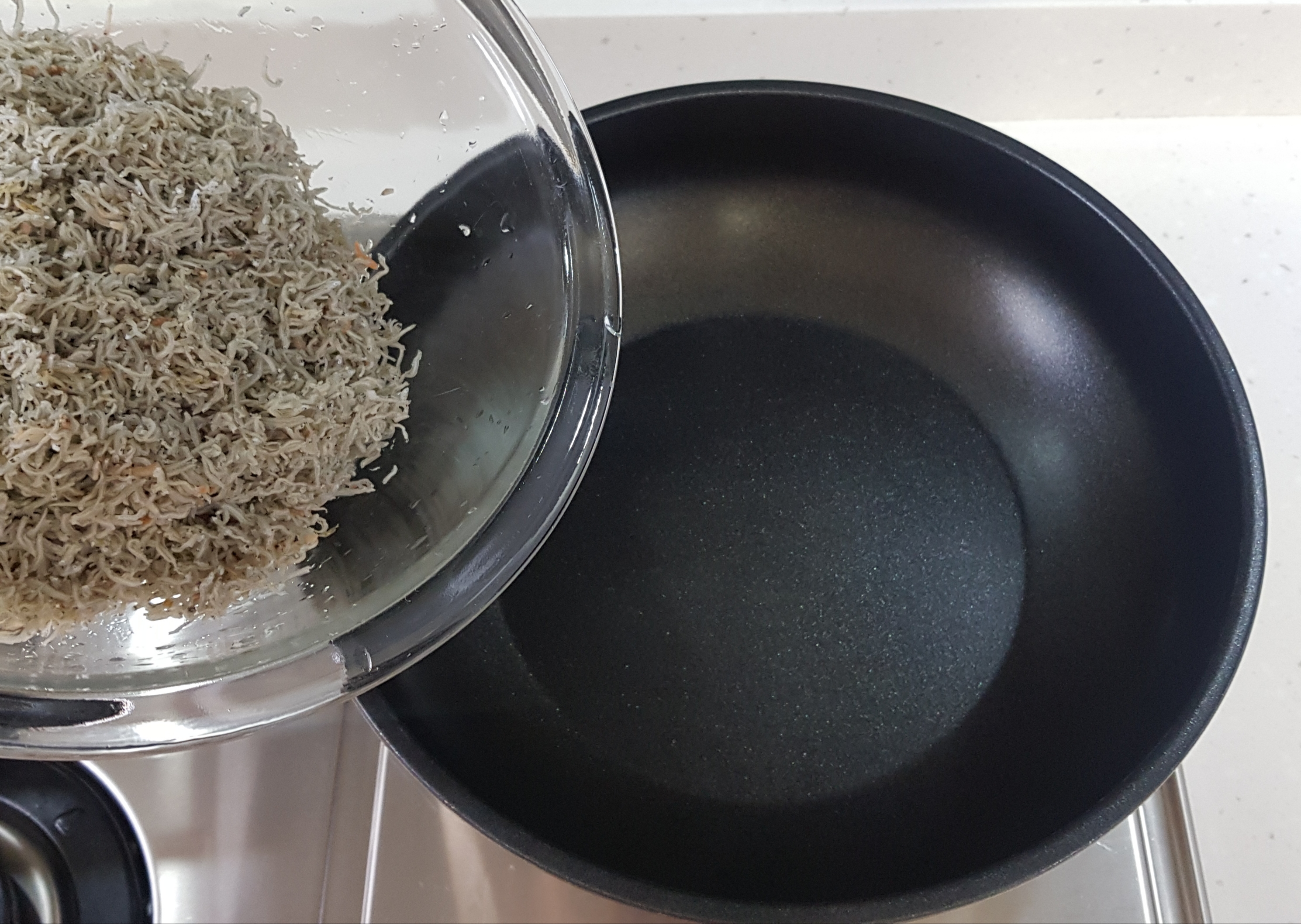 이 과정이 아주 중요한데요, 마른 팬에 멸치와 맛술 3 숟가락을 넣고, 물기가 완전히 없어지도록 중불에서 볶아요.