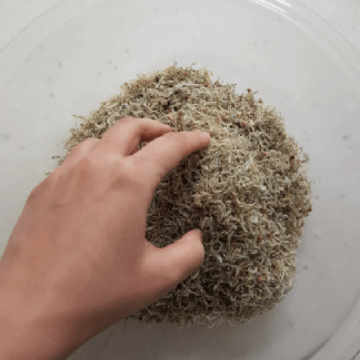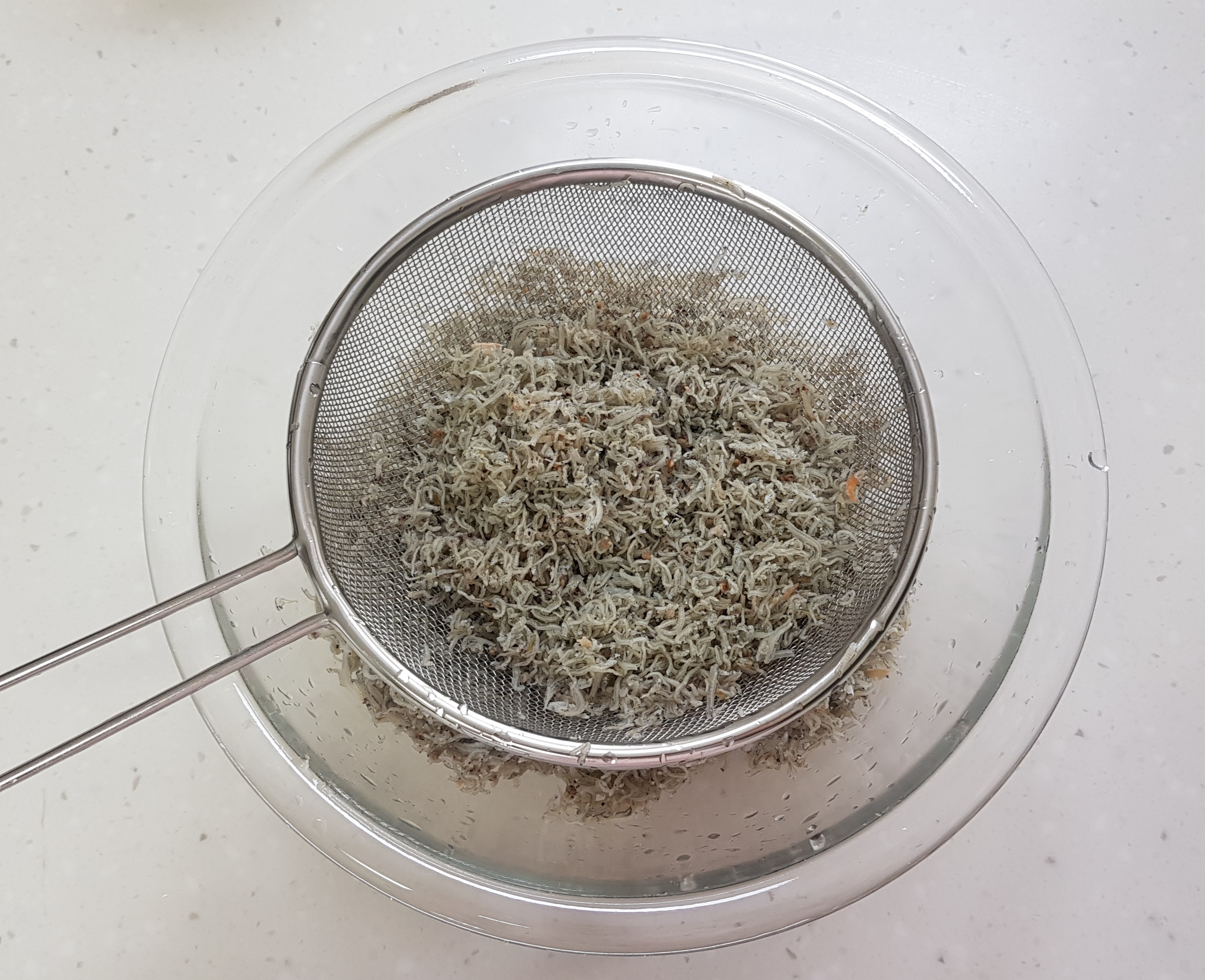 크기가 작은 볶음용 멸치를 채에 몇 번 털어주세요.