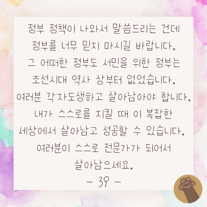 정부 정책을 활용해서 나에게 유리하게 자산을 키울 수 있는 힘을 키우려면 스스로 공부하는 수밖에 없어요.