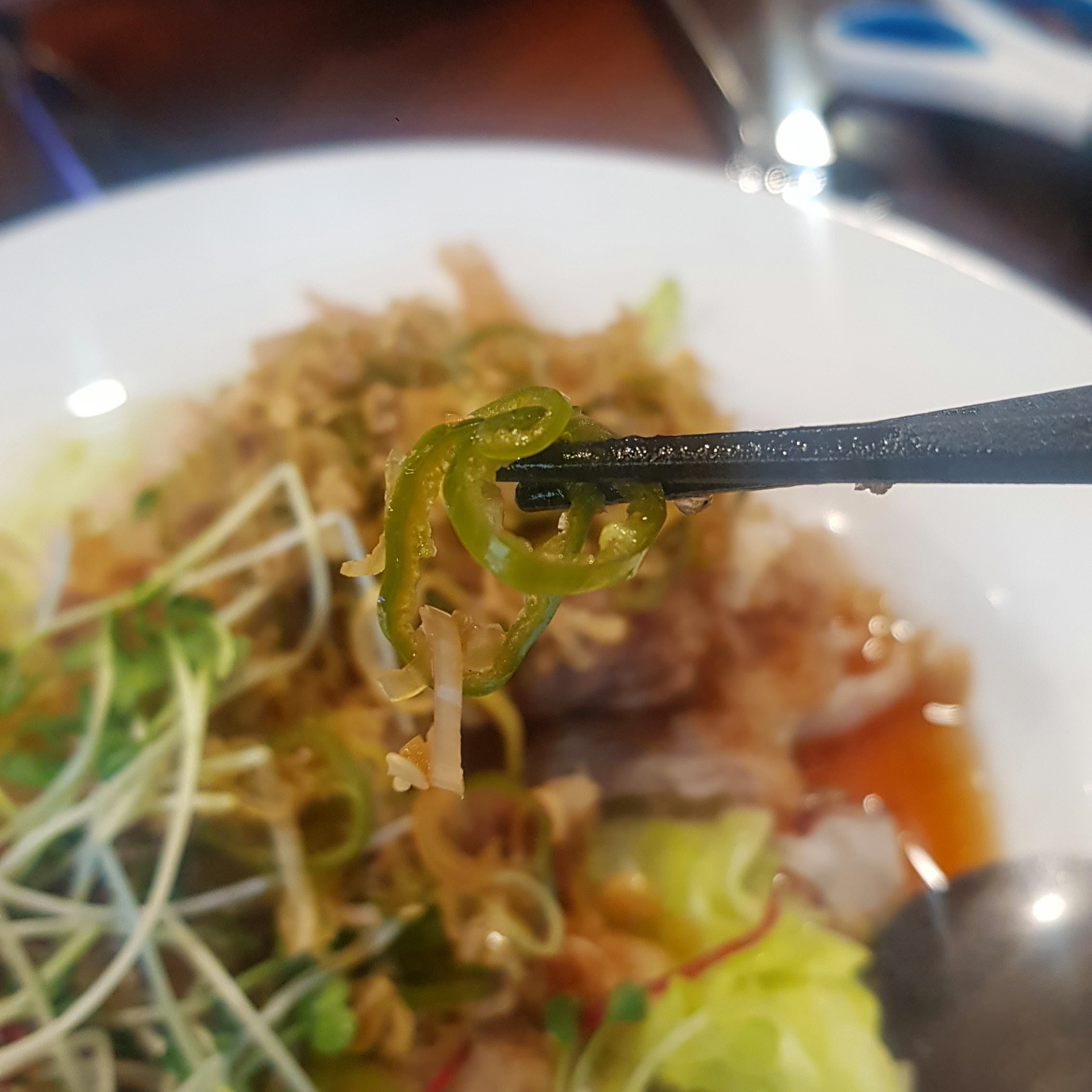 채소들 위에 고추를 살짝 얹어 먹어요.