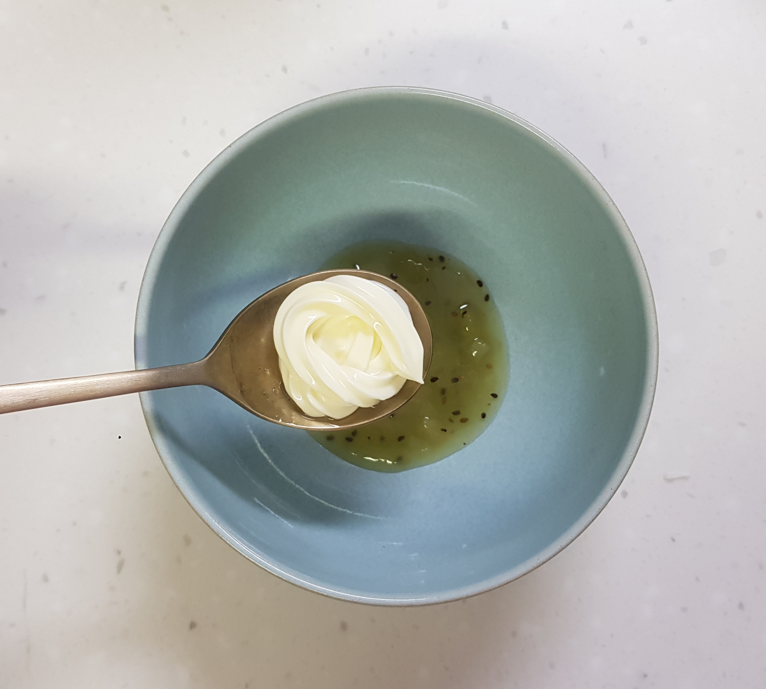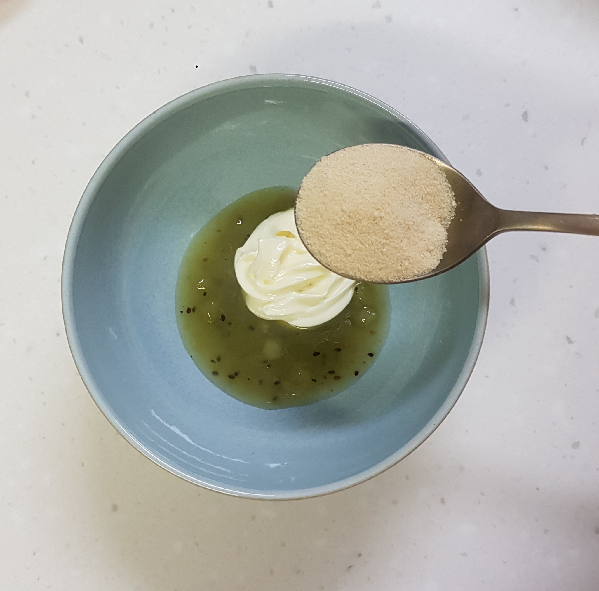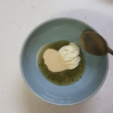 키위드레싱 4숟가락과 마요네즈 4숟가락, 설탕 2숟가락을 넣고 잘 섞어주세요.