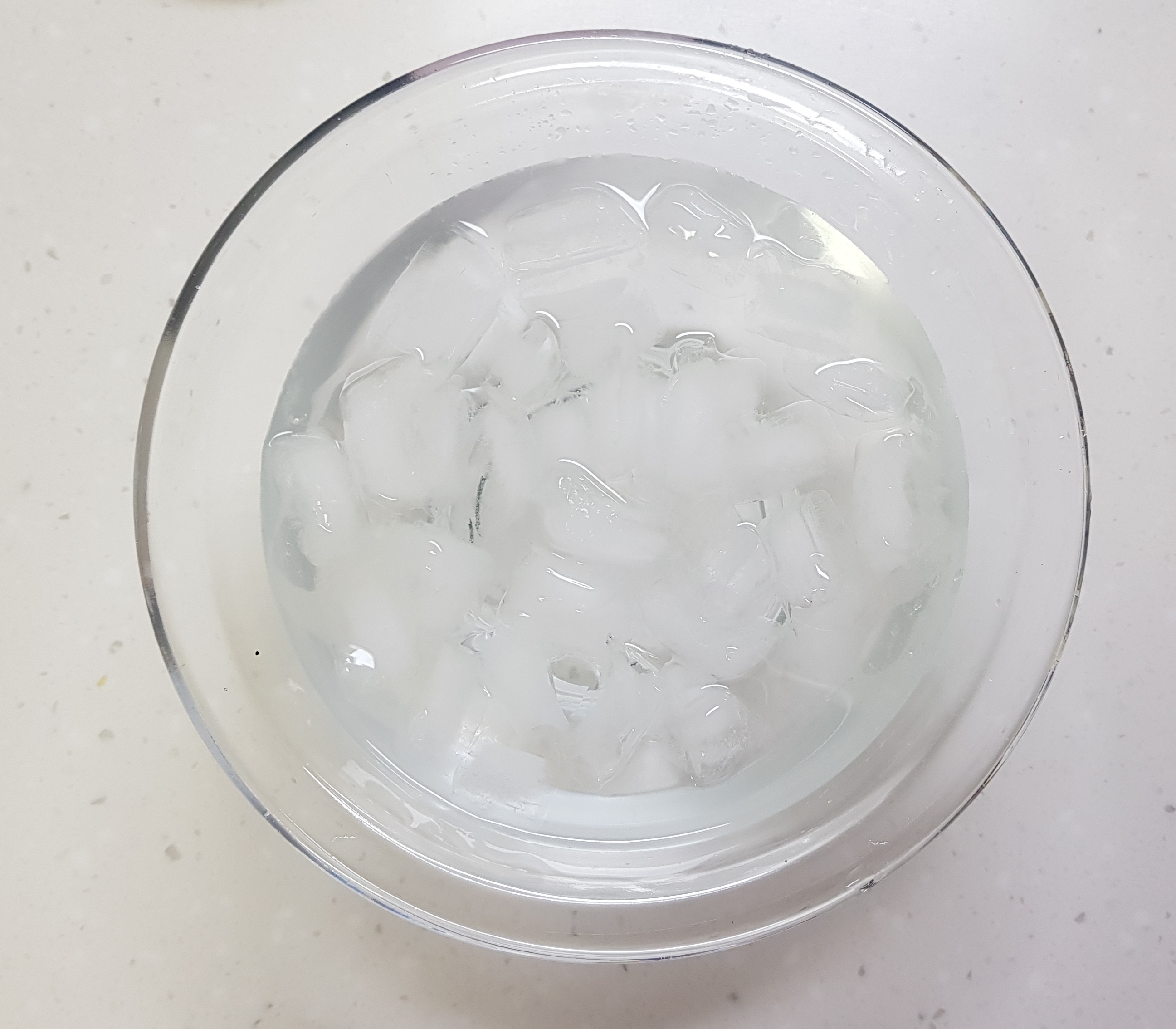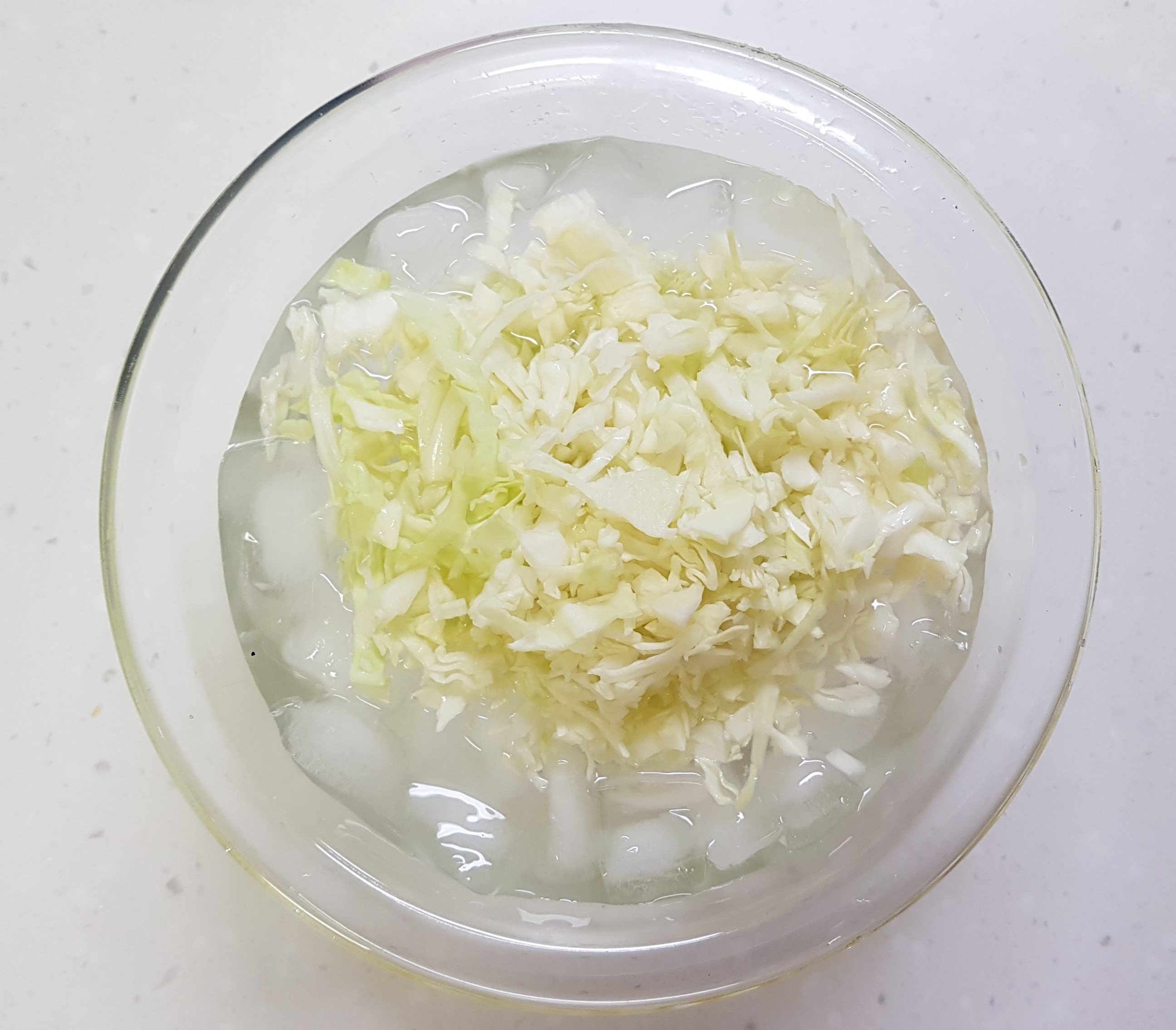 썰은 양배추는 더욱 아삭해 지도록 얼음물에 잠시 담가두어요.
